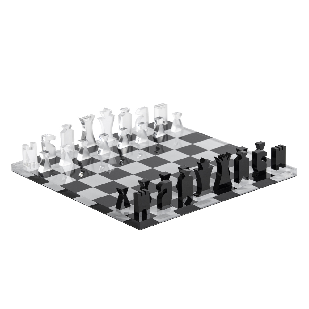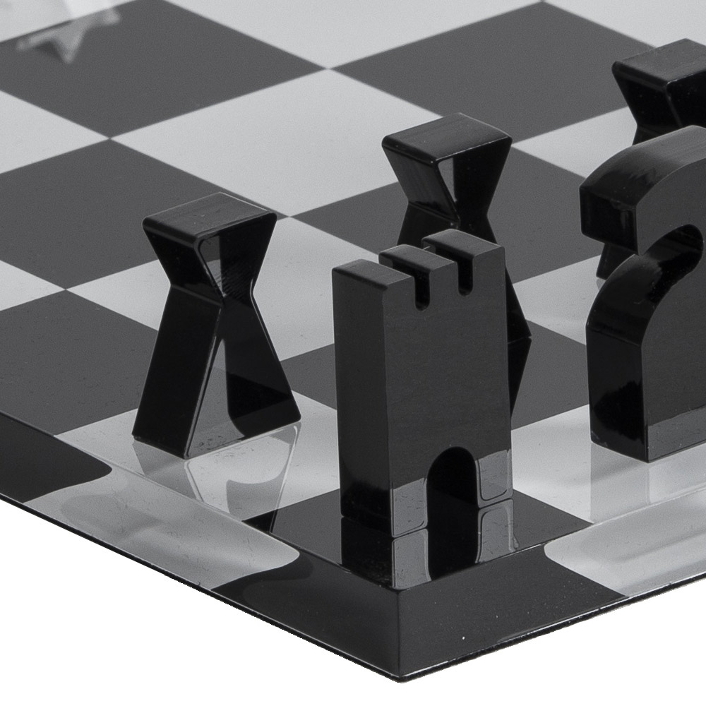 Elegante scatola porta scacchi e dama con scacchiera in cristallo acrilico trasparente serigrafato e nero.