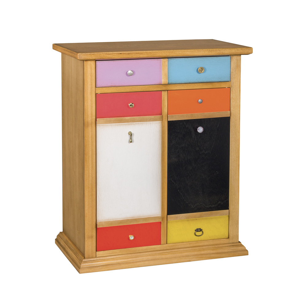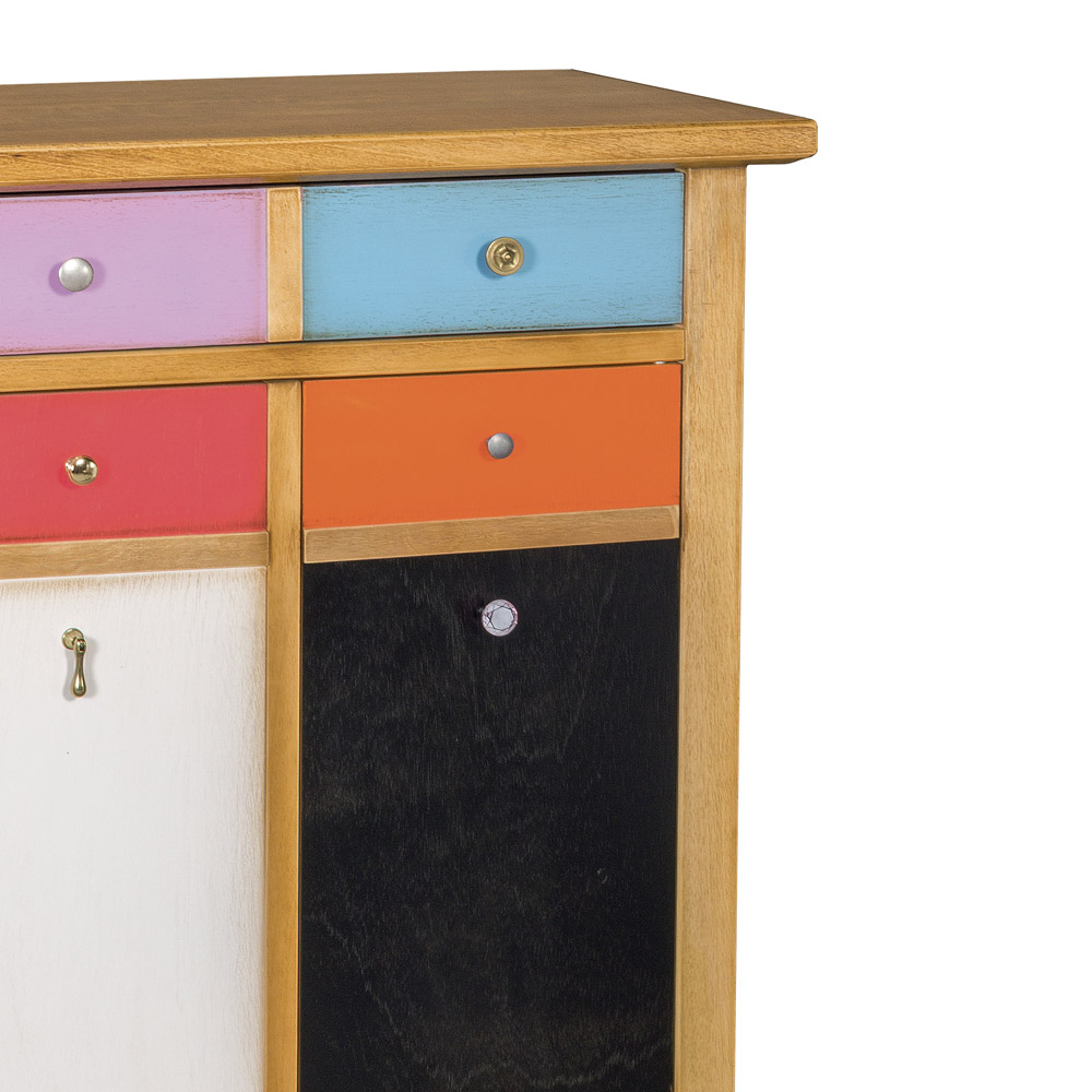 Allegria e giocosità sono le caratteristiche che descrivono questo elemento dai forti colori accesi e dalle particolari forme delle maniglie. Una reinterpretazione originale di un mobile dalla grande