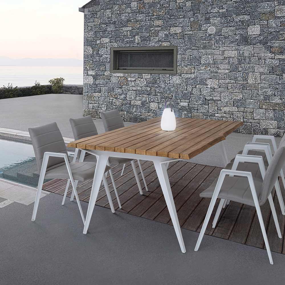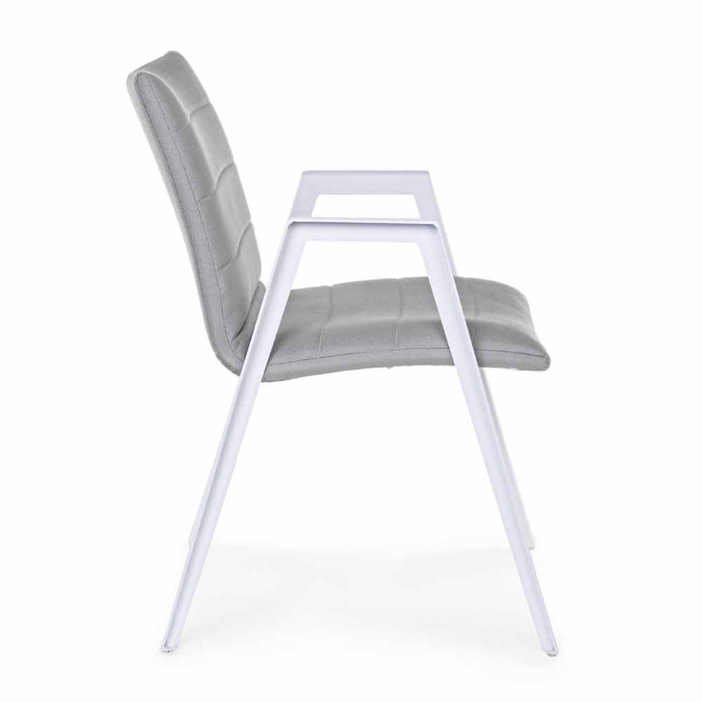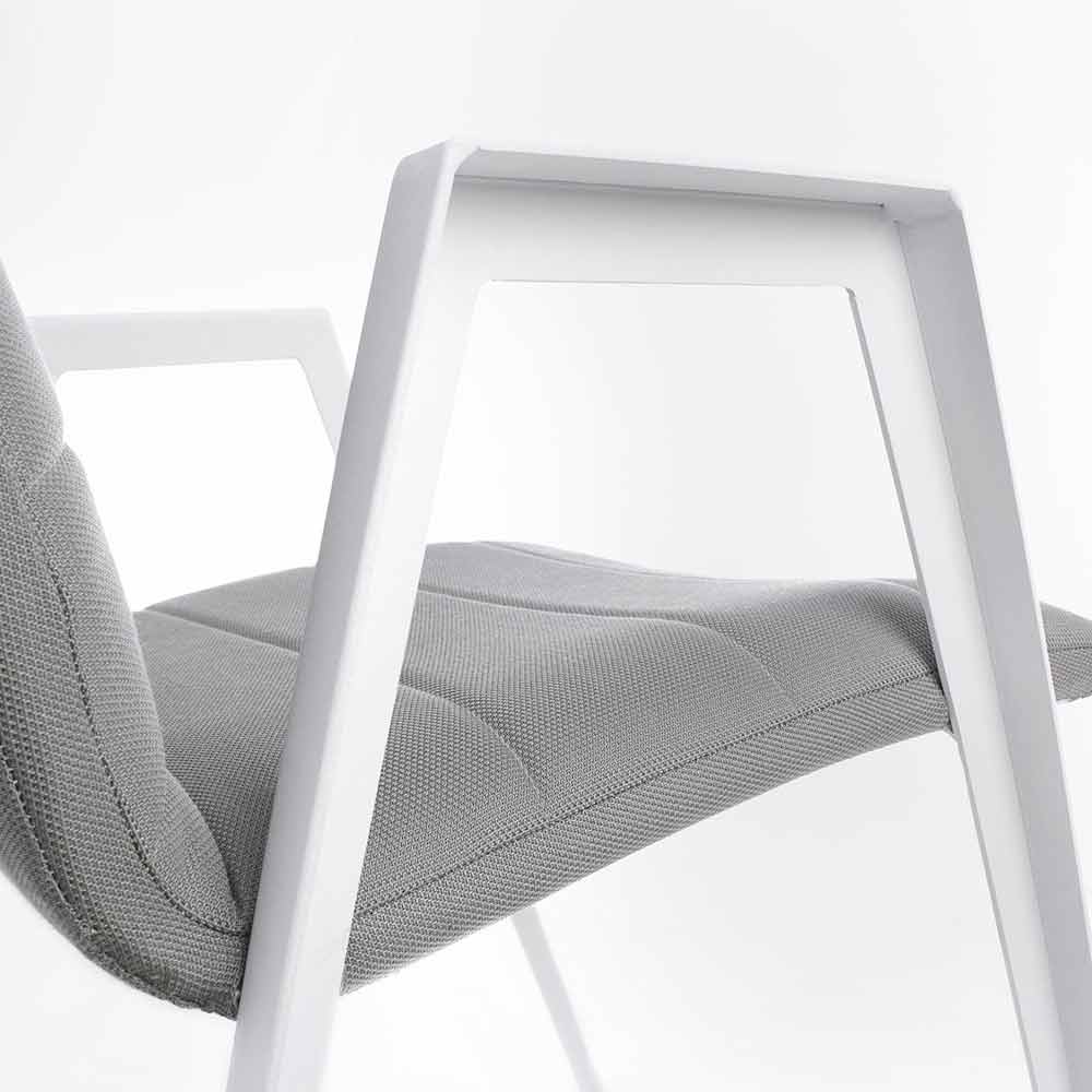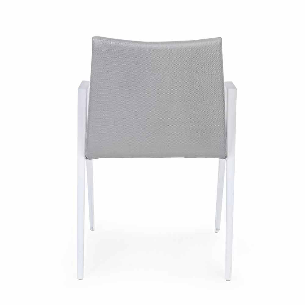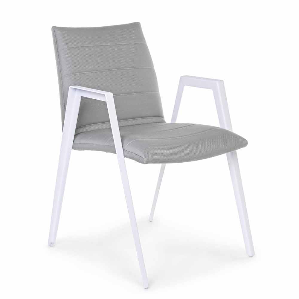 Sedia per esterno moderna con braccioli, gambe in alluminio bianco e seduta e schienale in textilene grigio.