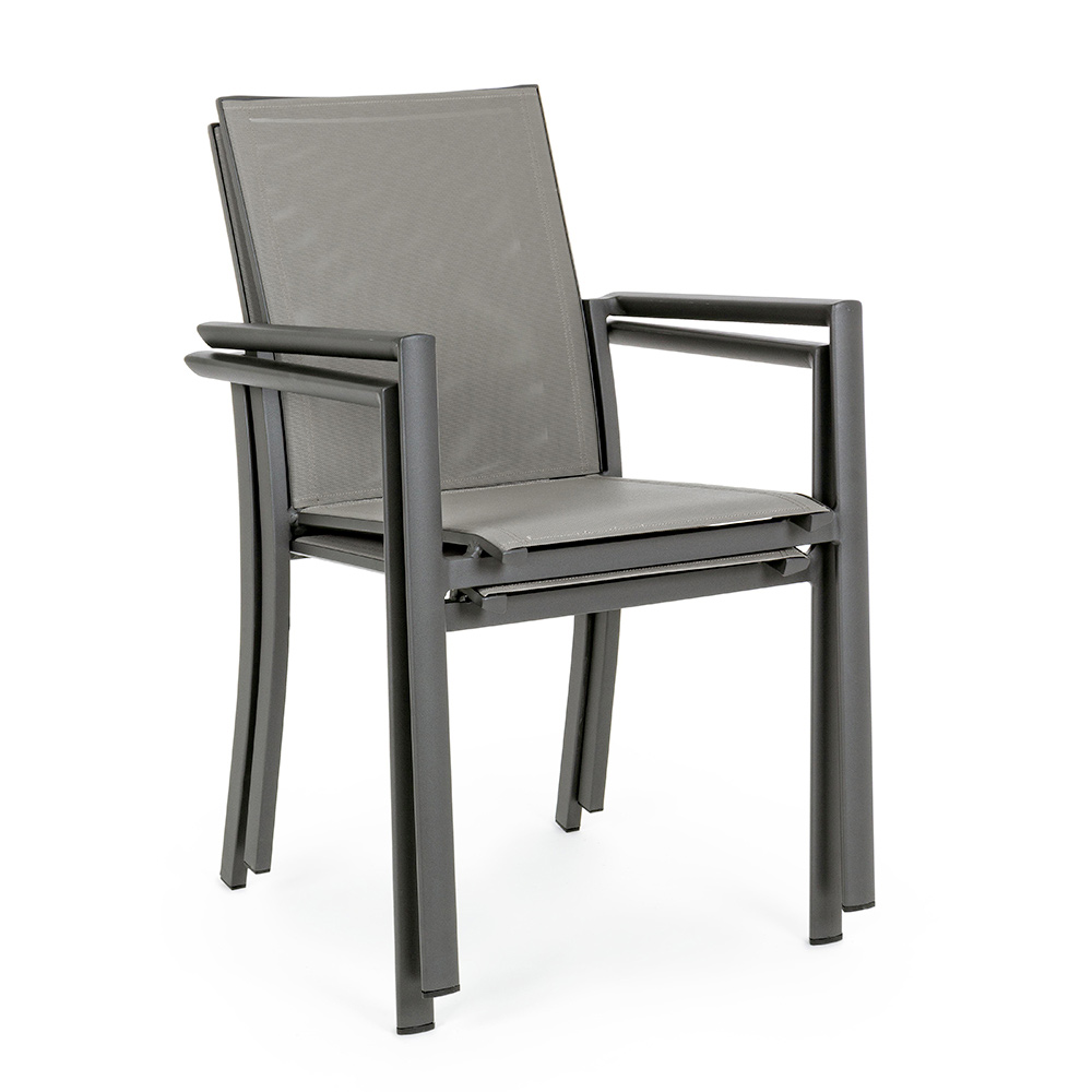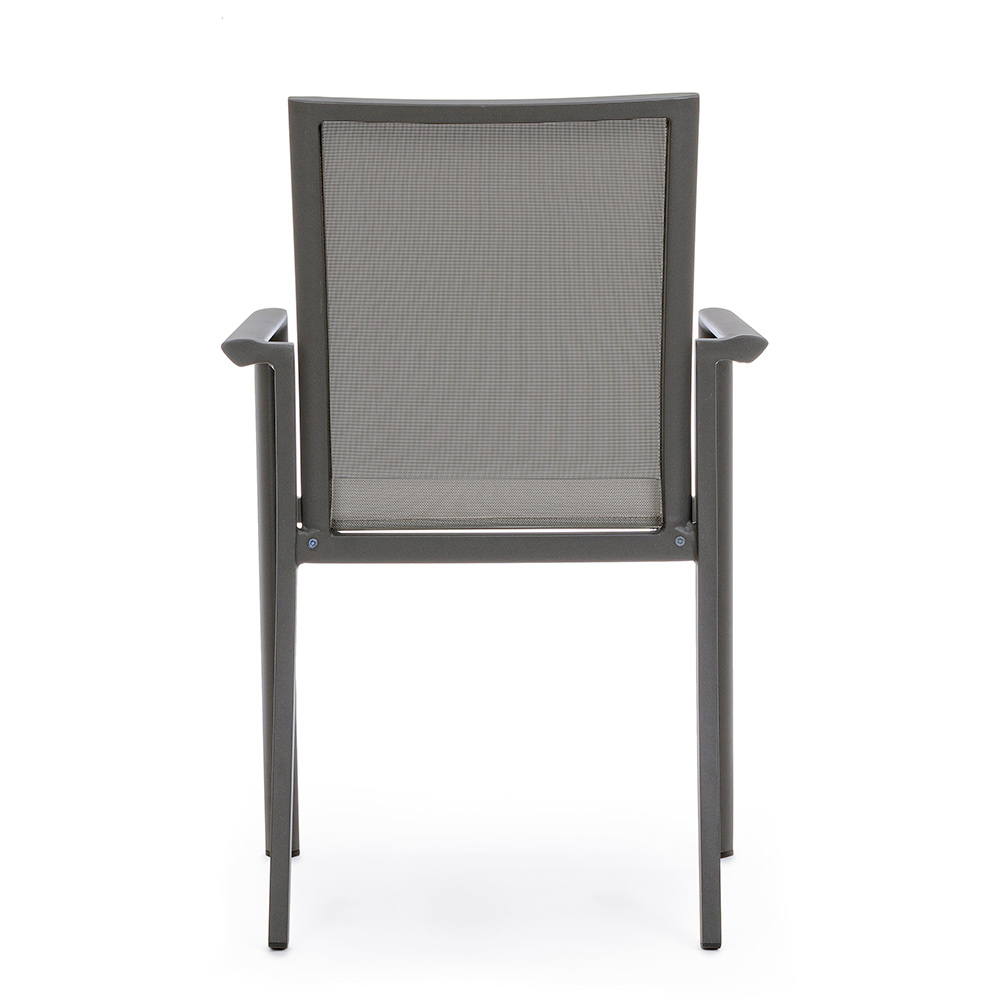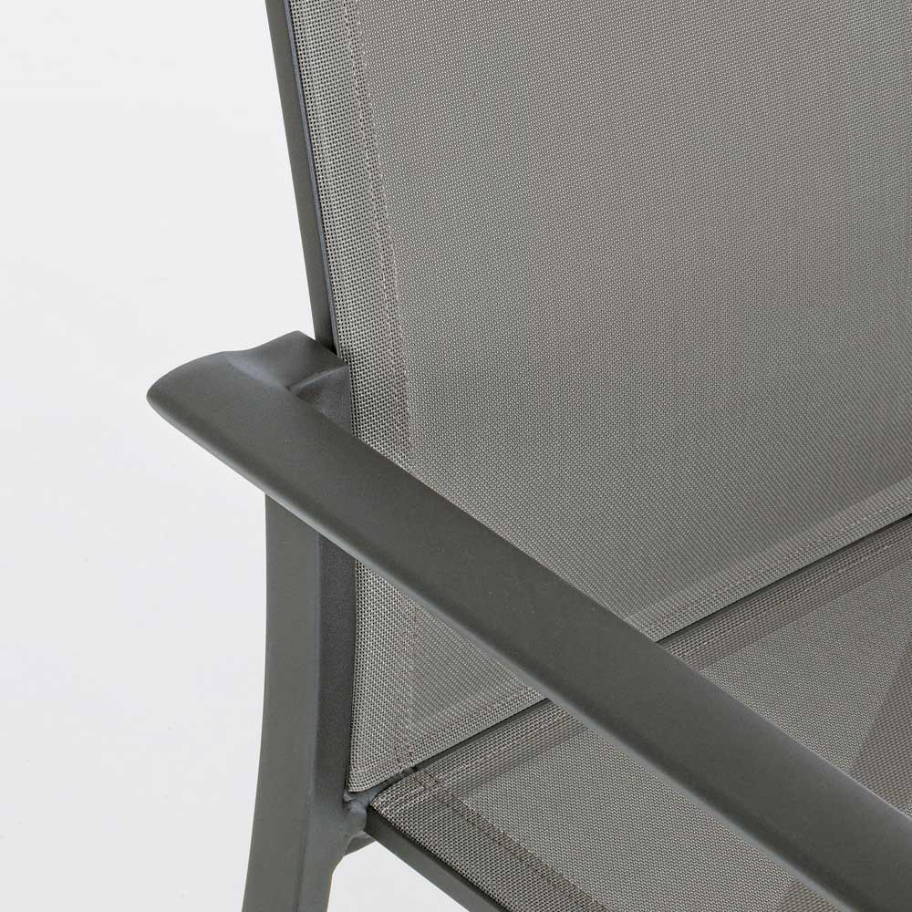 Struttura in alluminio verniciato a polvere (poliestere). Seduta e schienale rivestiti in textilene Phifer 1x1. Impilabile.