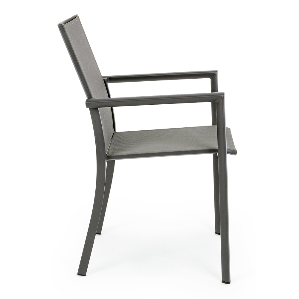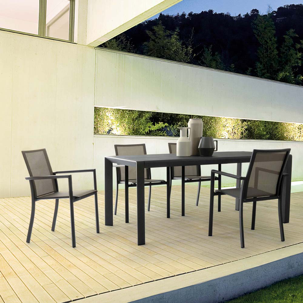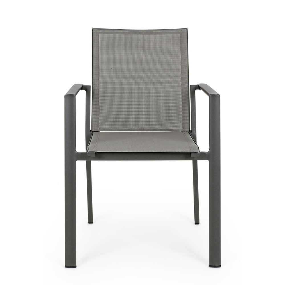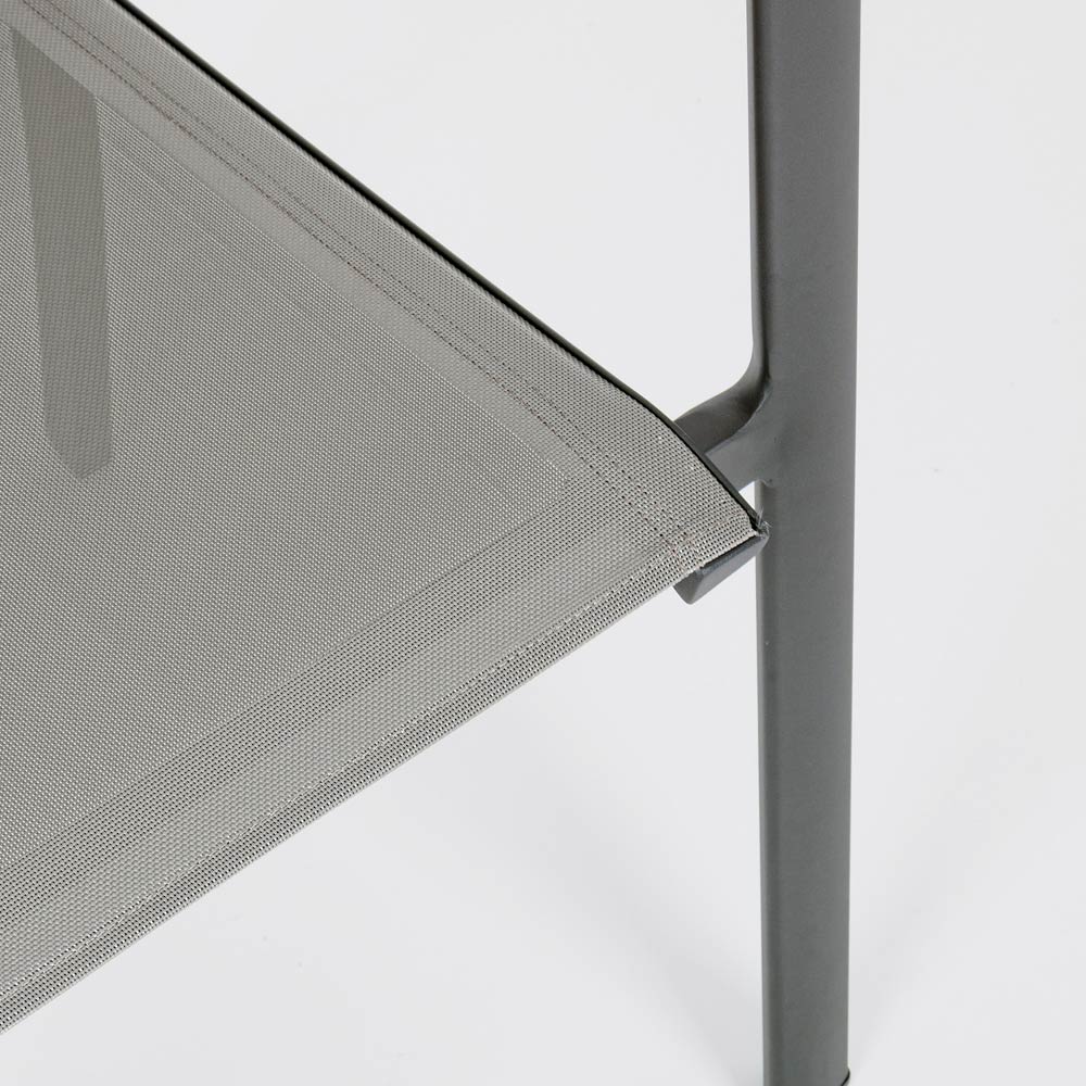 Struttura in alluminio verniciato a polvere (poliestere). Seduta e schienale rivestiti in textilene Phifer 1x1. Impilabile.