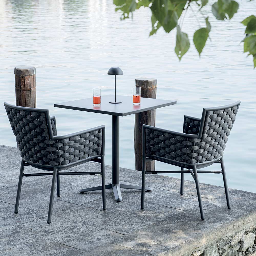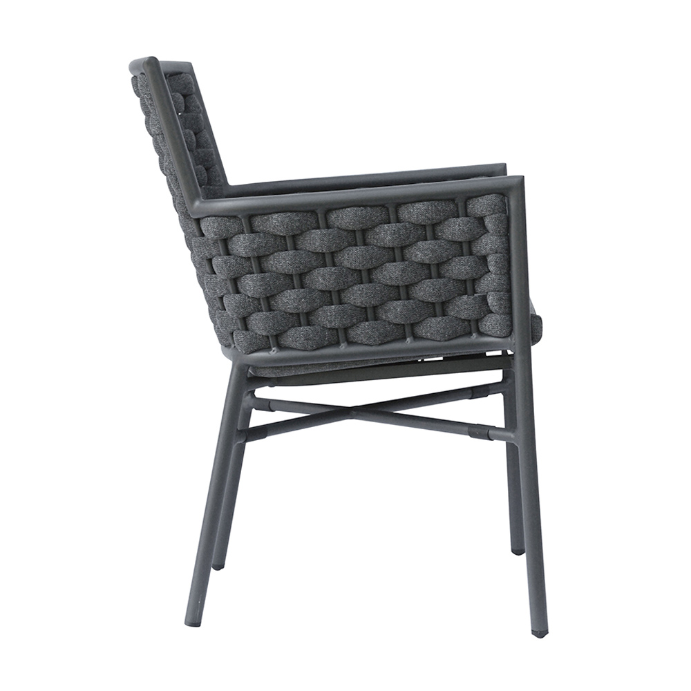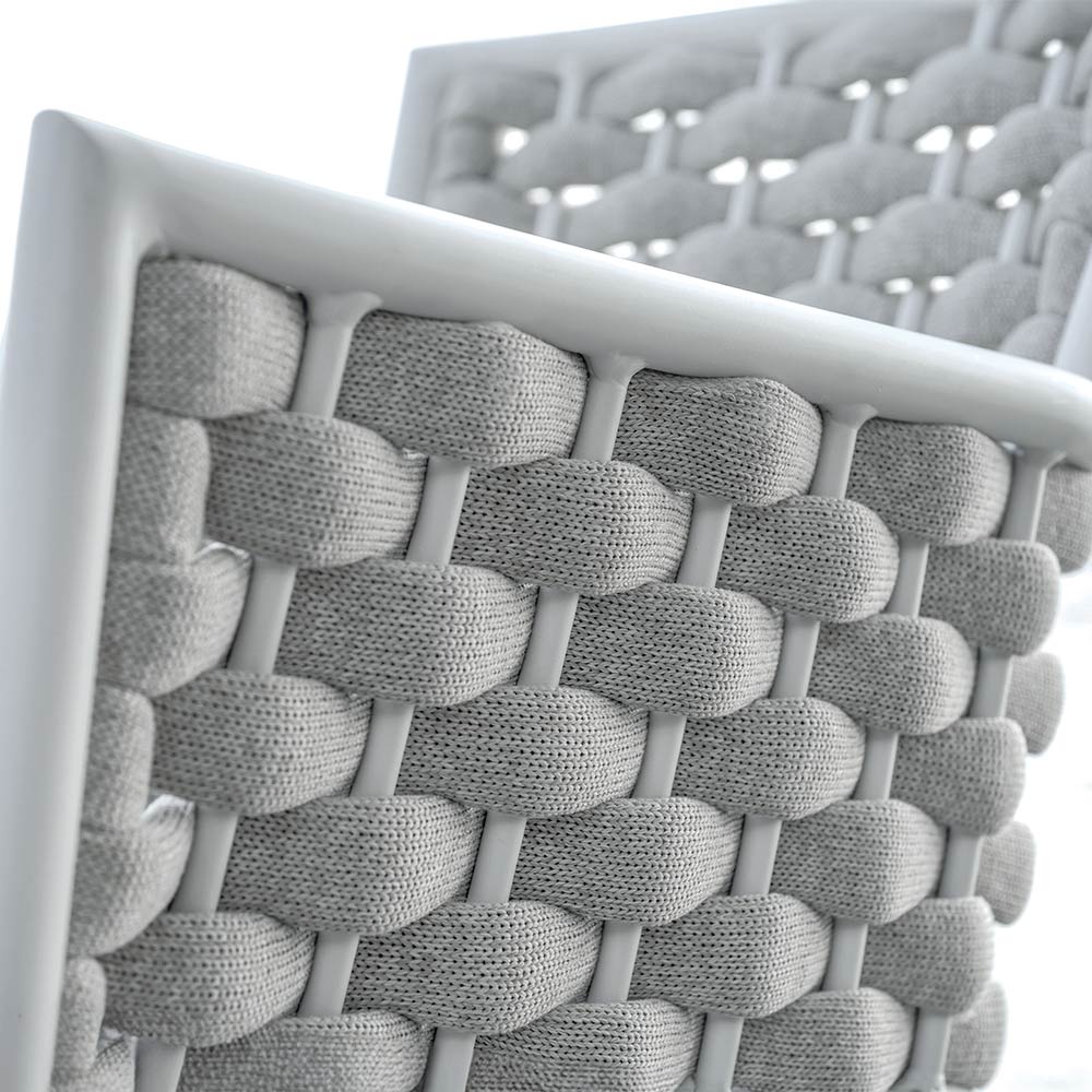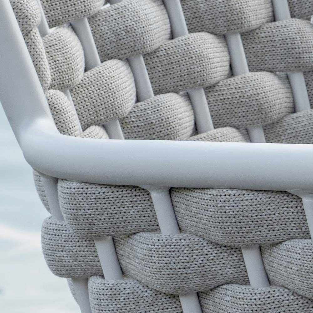 Raffinatezza e comfort si incontrano in questa sedia per esterni dal design moderno e accogliente. Lo schienale e i braccioli in corda intrecciata, morbidi e resistenti, aggiungono un tocco di eleganza artigianale, mentre l’imbottitura offre un comfort superiore, ideale per momenti di relax all’aperto.