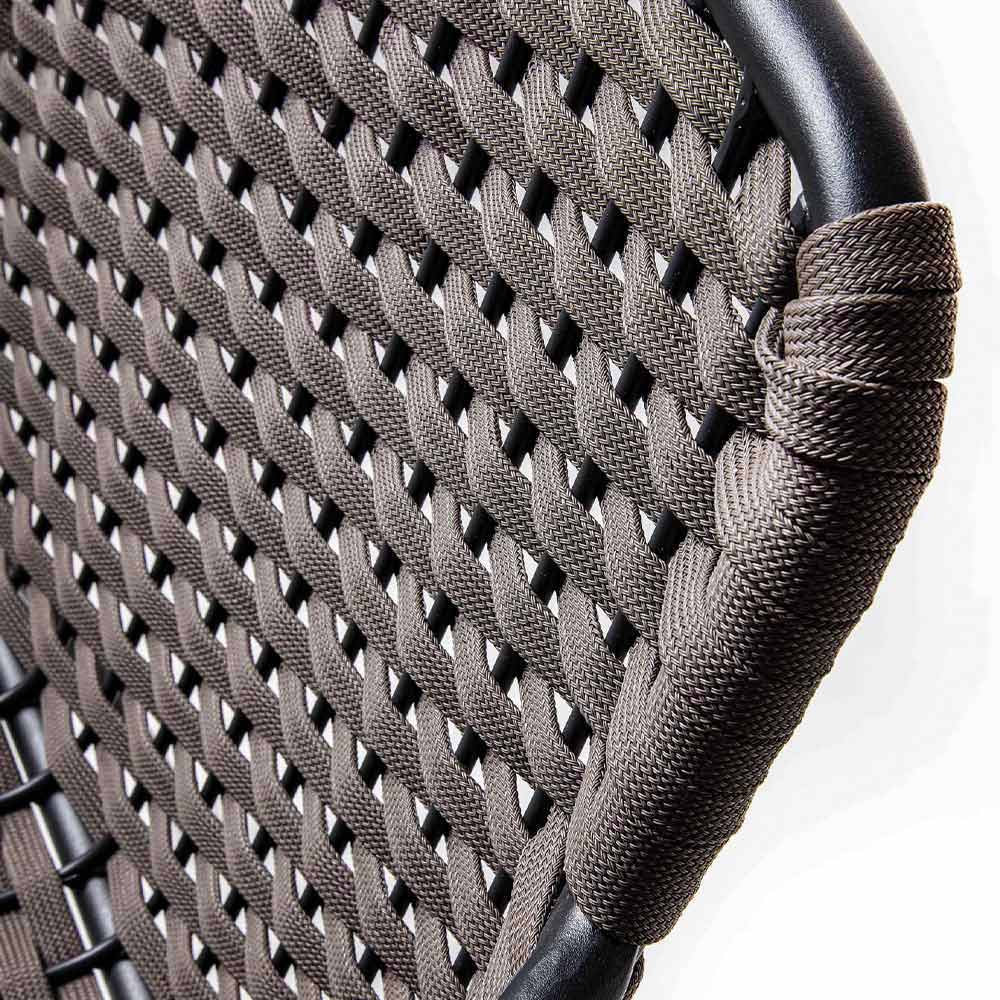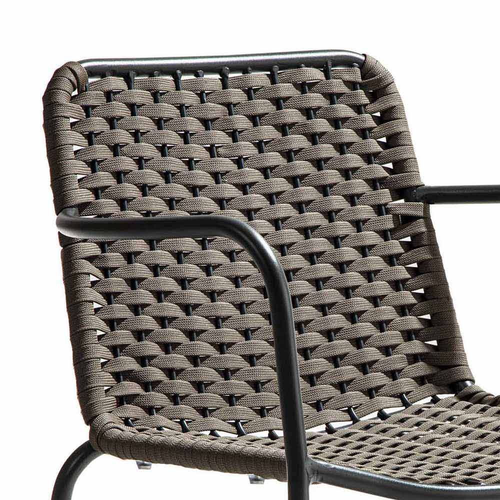 Sedia da giardino realizzata in metallo zincato finitura antracite con seduta e schienale in intreccio di corda poliestere (interno in gomma) finitura antracite, dotata di braccioli e struttura impilabile. Dall'incontro tra un design essenziale e versatile e un'estetica funzionale e confortevole nasce una seduta che si abbina perfettamente ad ogni situazione outdoor creando una perfetta armonia con gli altri elementi presenti o giocando su meravigliosi contrasti di stile per un risultato esclusivo e all'avanguardia.