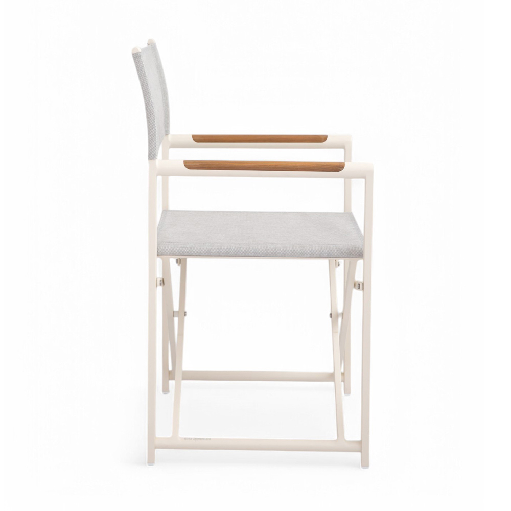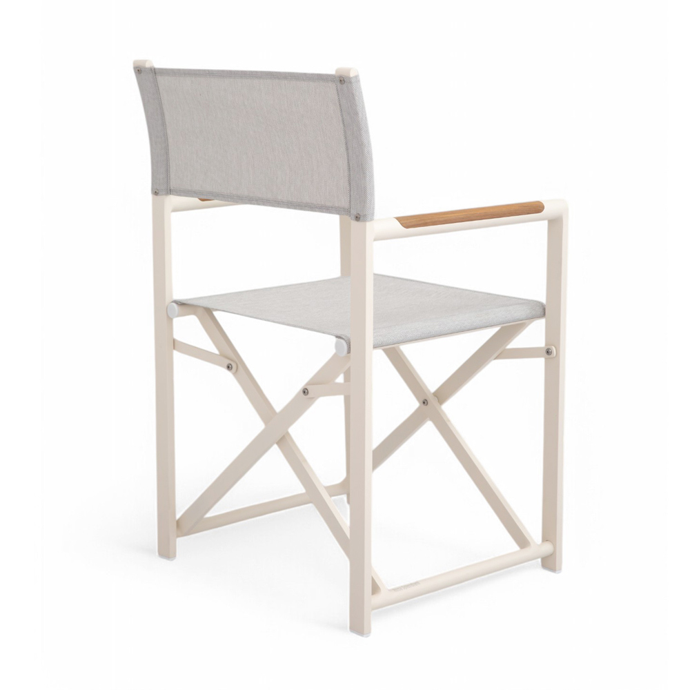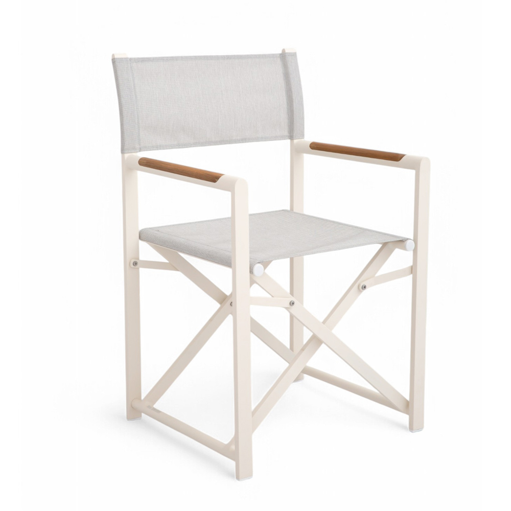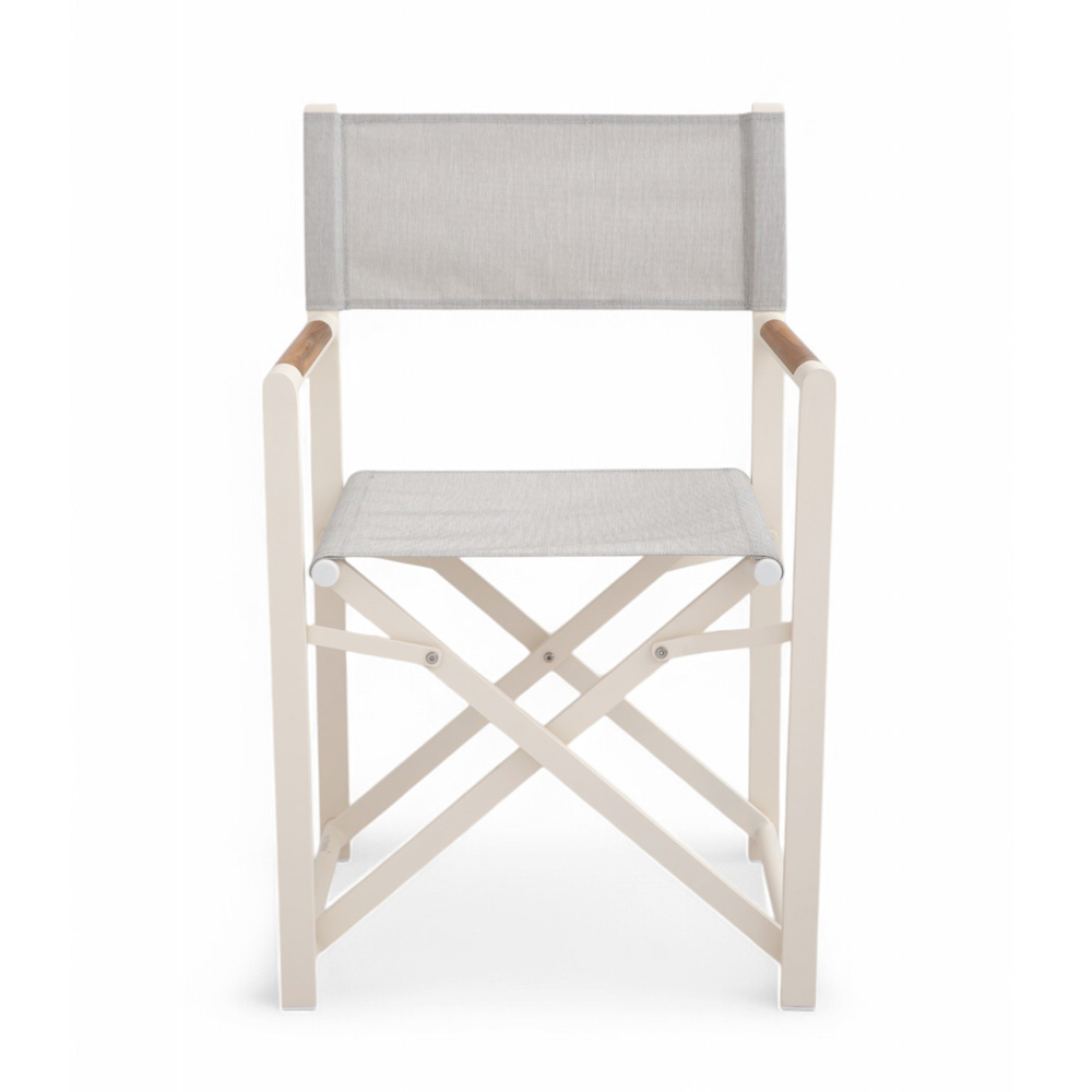 Porta un tocco di eleganza e praticità al tuo spazio outdoor con questa sedia da regista per esterni. Realizzata con una robusta struttura in alluminio verniciato a polvere, questa sedia è progettata per resistere agli agenti atmosferici senza compromettere lo stile.