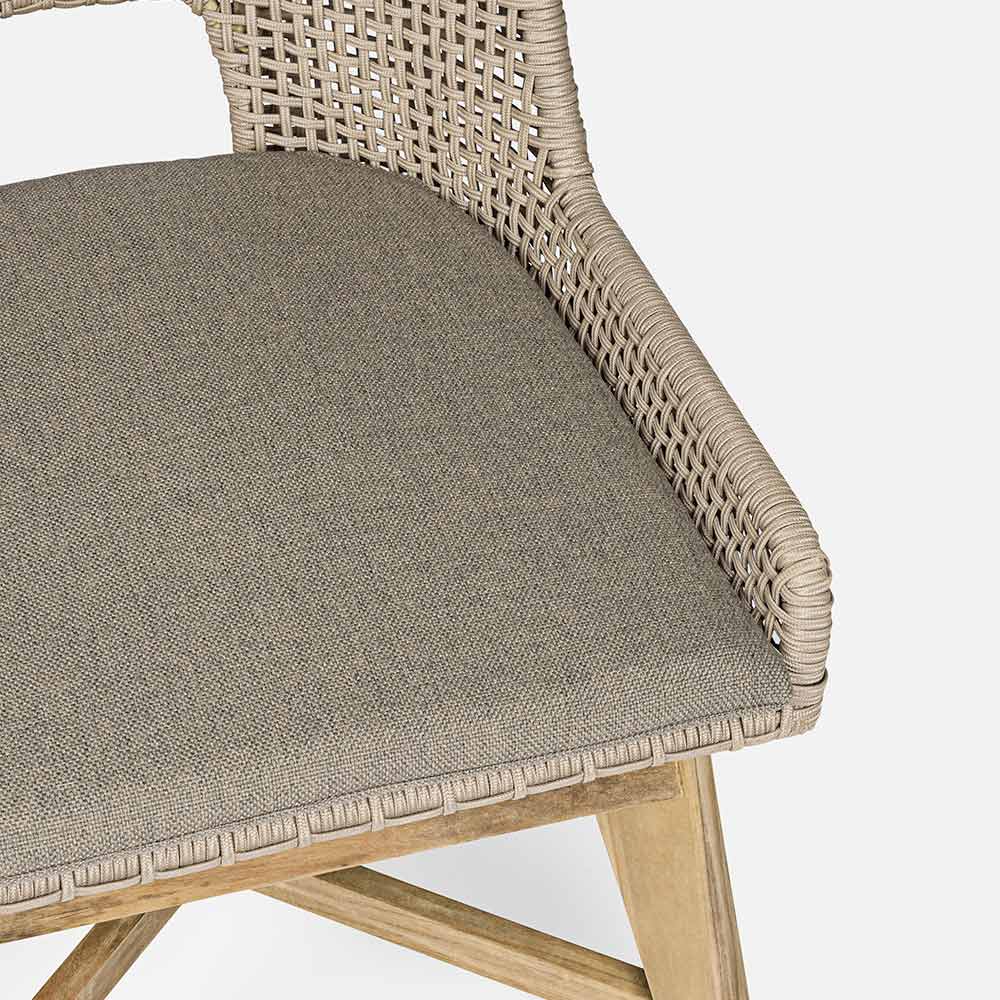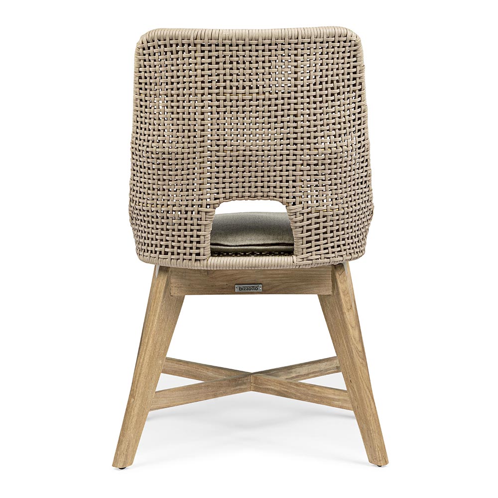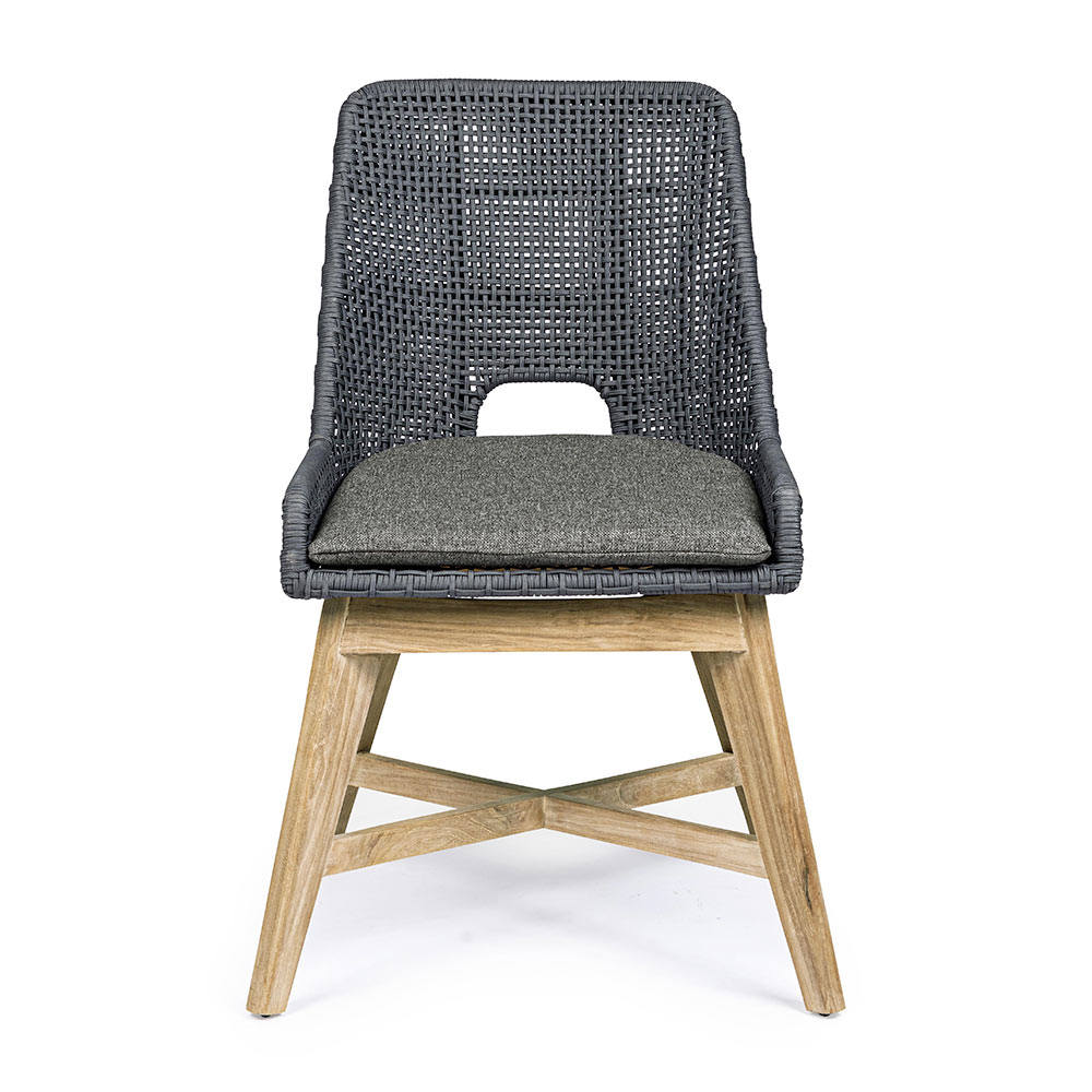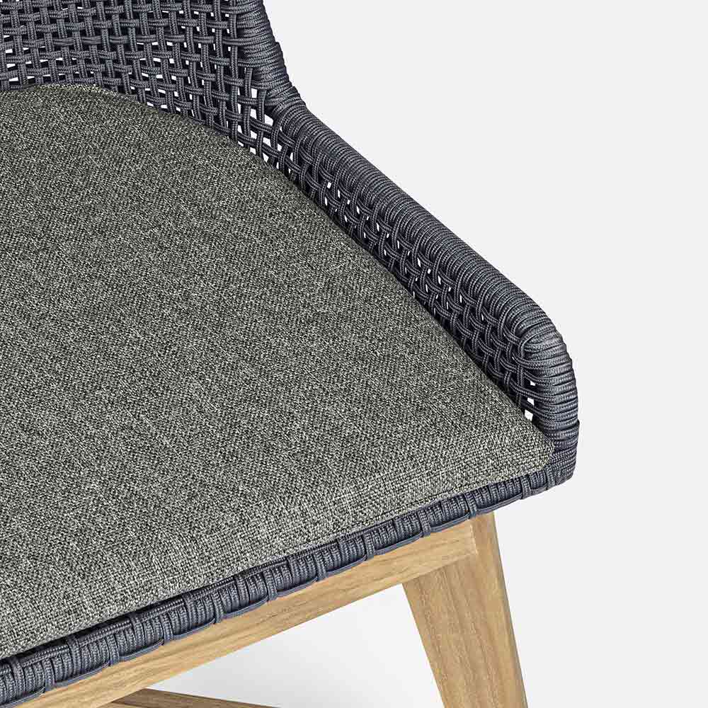 Sedia da esterno con gambe in legno di teak e seduta in corda e tessuto, 2 pezzi.