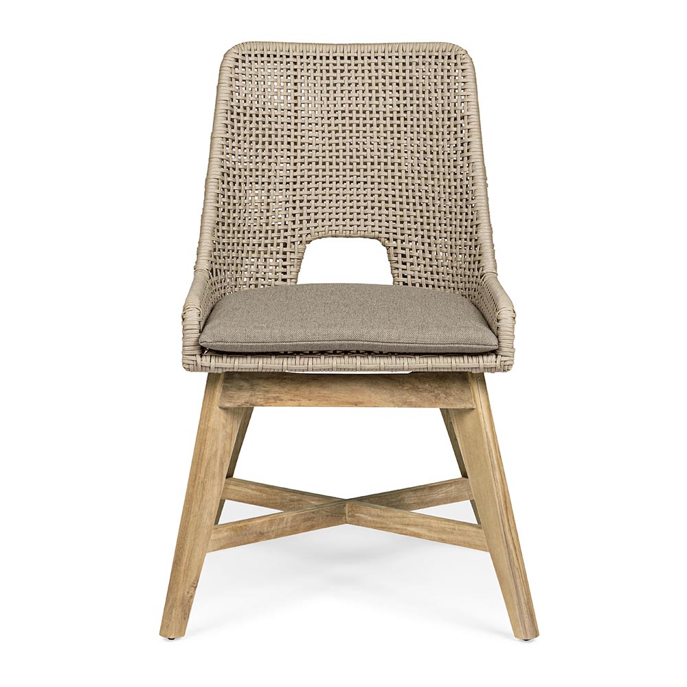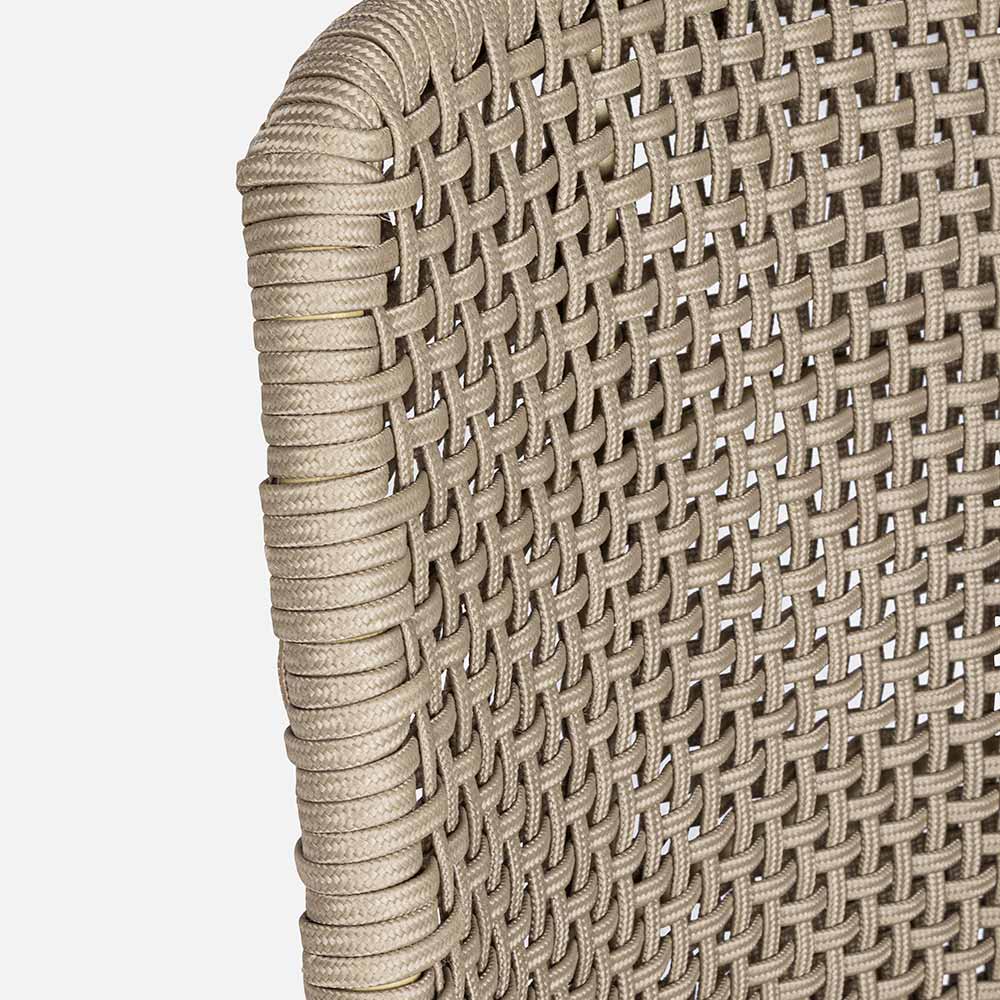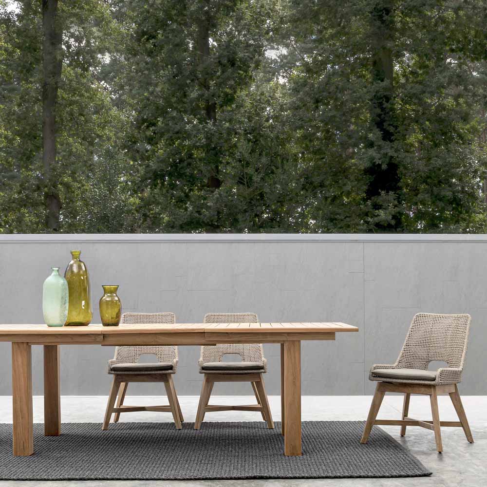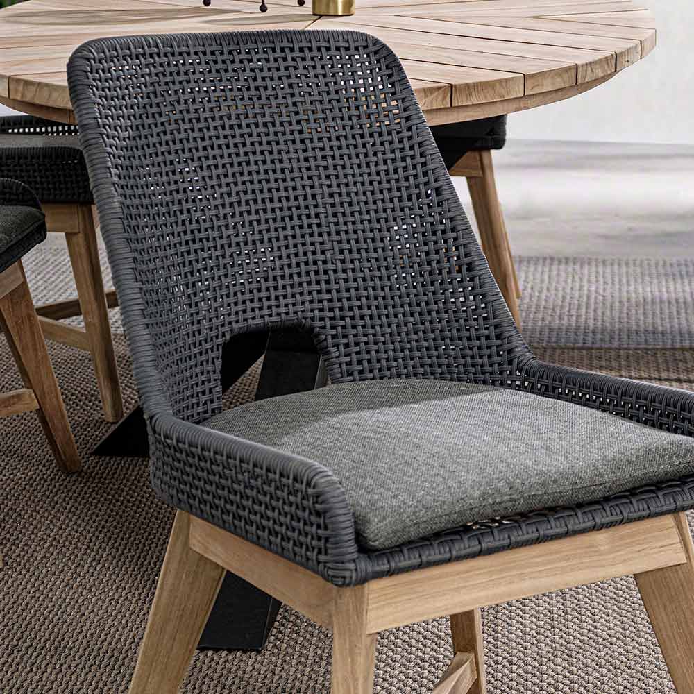 Sedia da esterno con gambe in legno di teak e seduta in corda e tessuto, 2 pezzi.