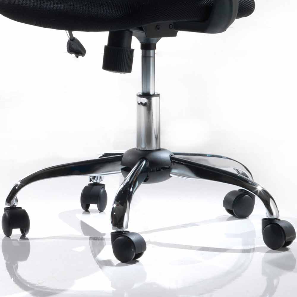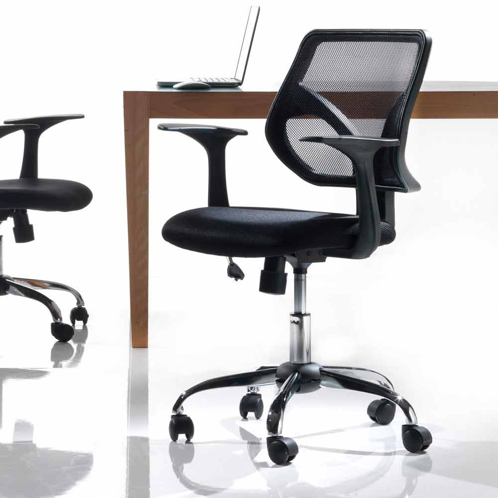 La sedia da ufficio girevole Giovanna è ideale regala libertà di movimento e massimo confort a chi la usa; si presenta con un sedile girevole con alzo a gas, struttura in metallo cromato con ruote in poliuretano; seduta rivestita in puma nero e schienale in tecnorete microforata nera.