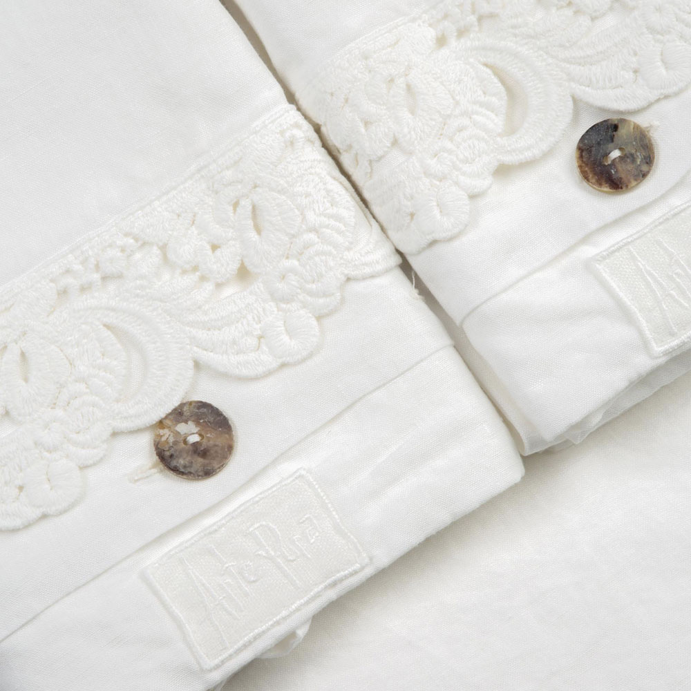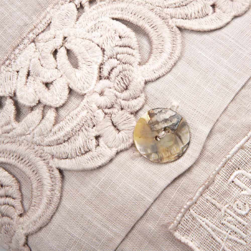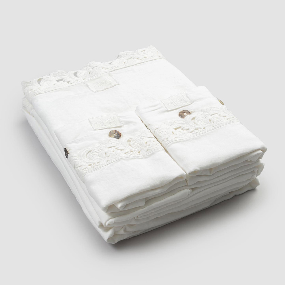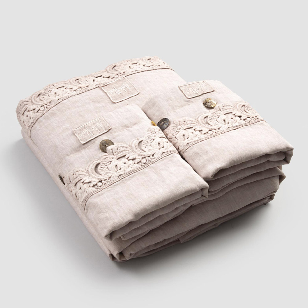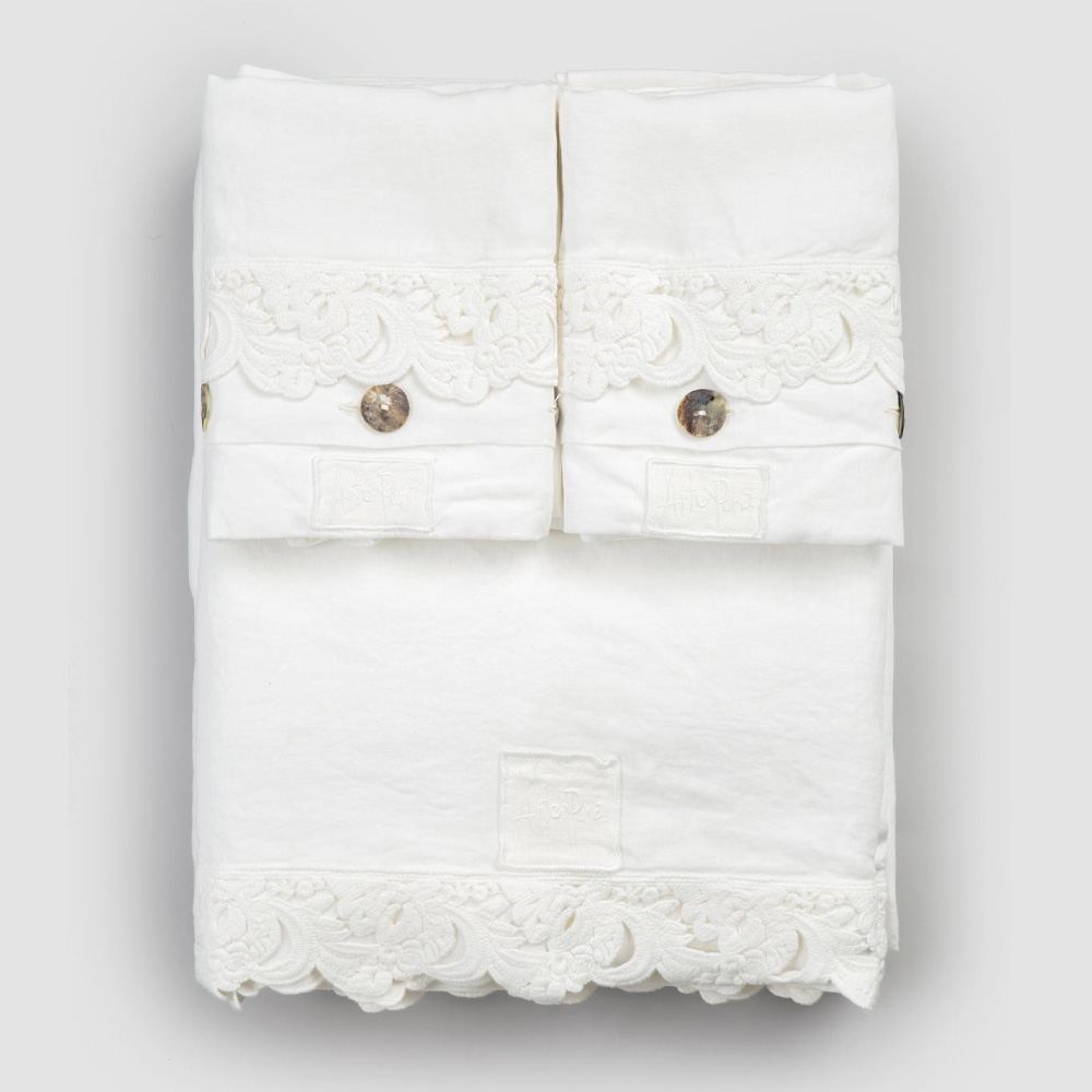 Completo lenzuola matrimoniali in lino con pizzo armonia in due colori, lusso made in Italy.