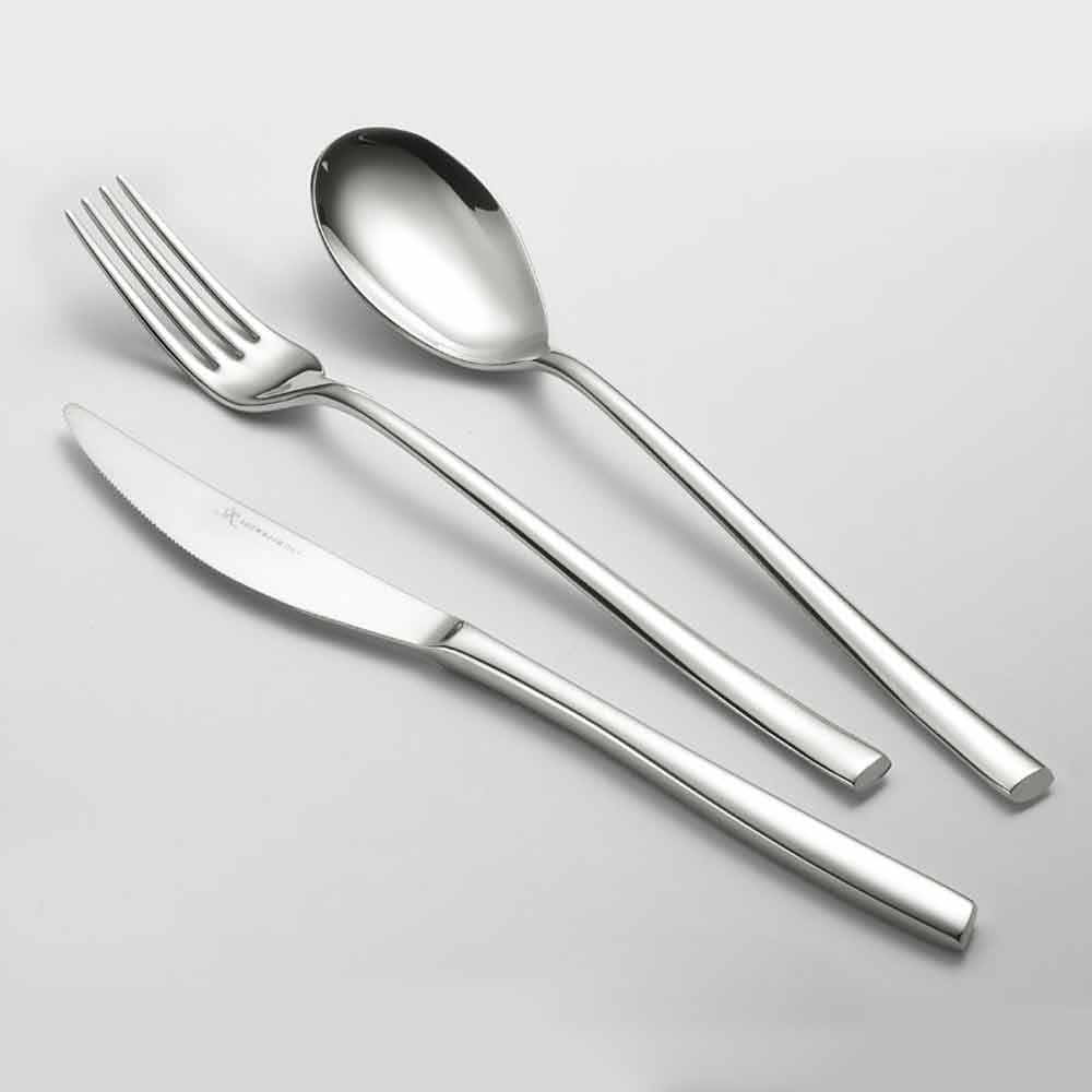 contrasto di forme: sull'apparecchiata infatti spiccano le linee sinuose e morbide del cucchiaio, e quelle affusolate ed eleganti del manico del coltello. A concludere la scena, l'impugnatura delle posate termina con un