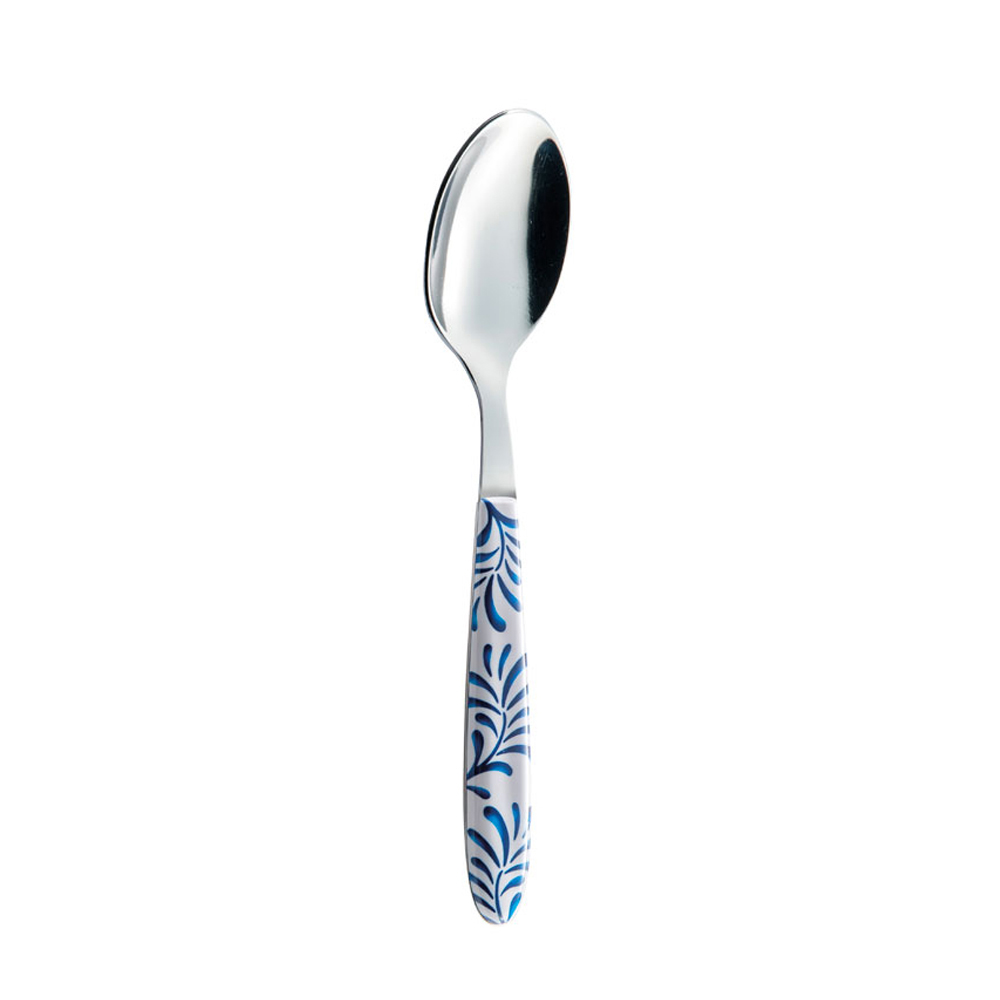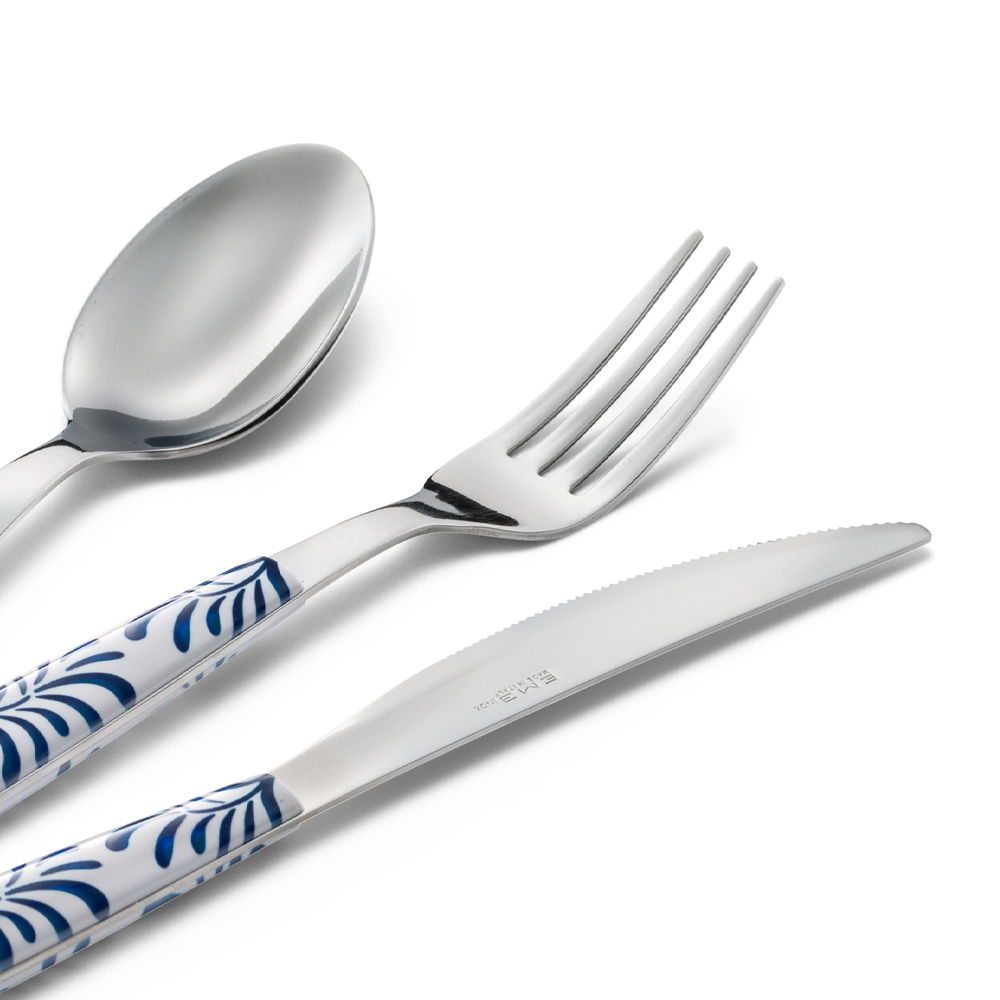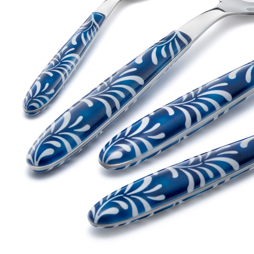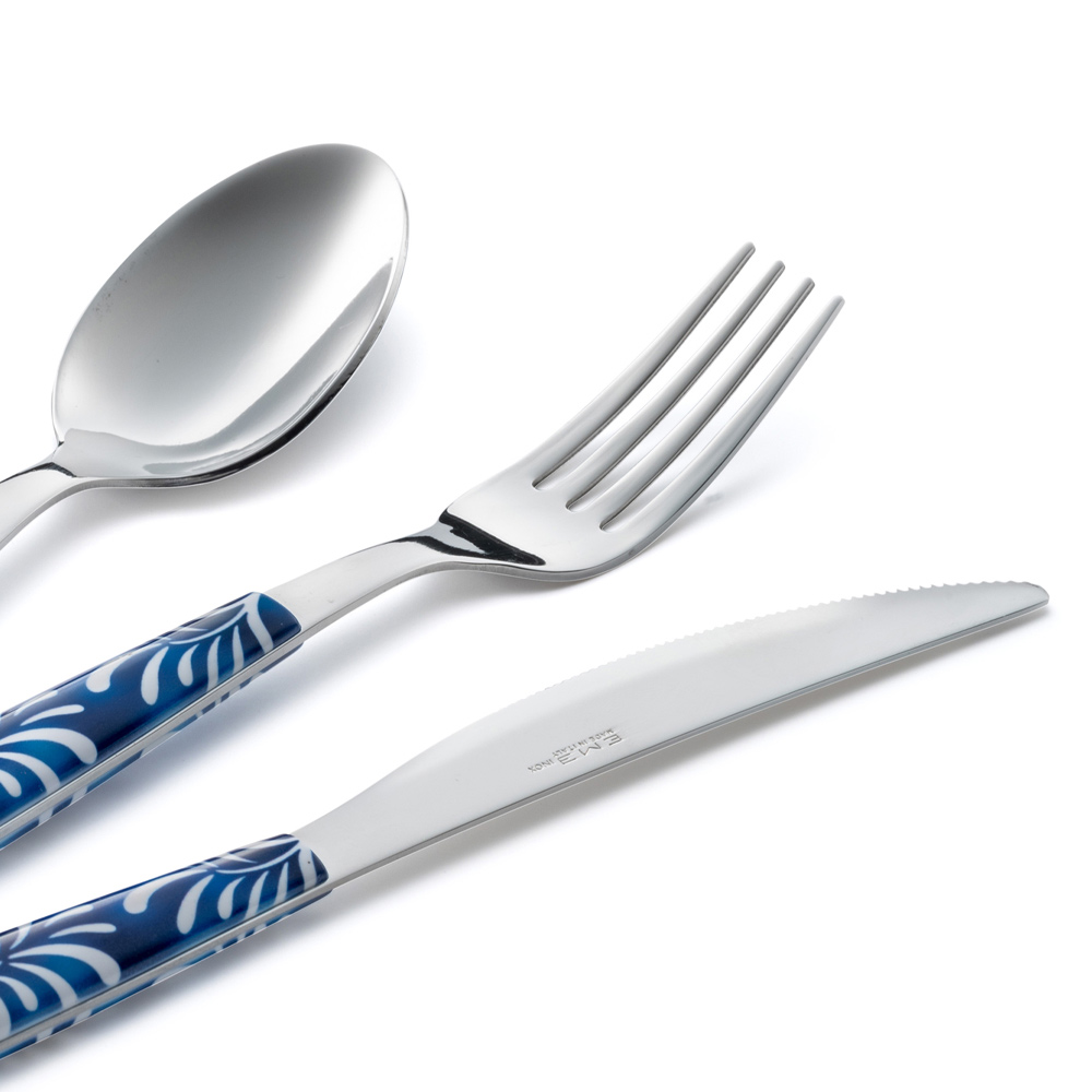 Servizio posate in acciaio inox e manico in plastica decorata bianca o blu, 24 pezzi made in Italy.