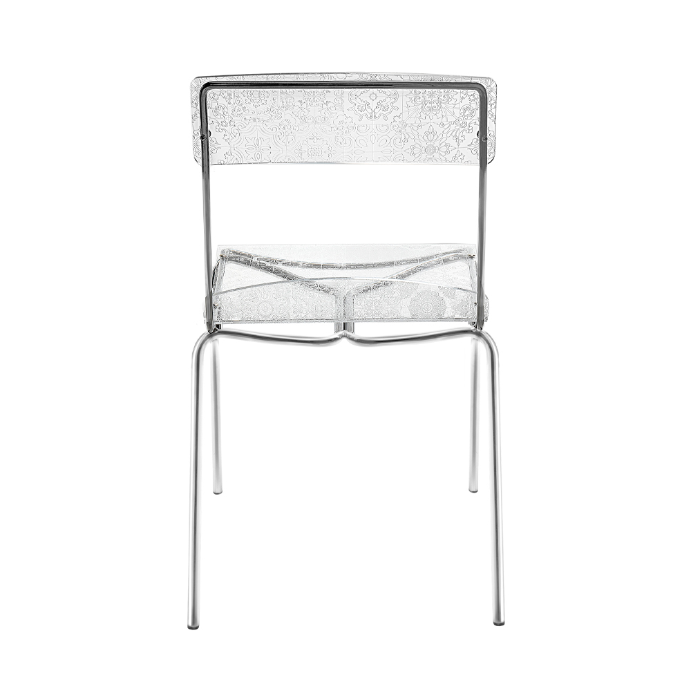 Realizzata con maestria in plexiglass 100% da polimero vergine, la sedia vanta una scocca trasparente che celebra la sua unica geometria. Ogni angolo, ogni linea, ogni curva è pensata per catturare e riflettere la luce, mantenendo la sua brillantezza impeccabile anno dopo anno.