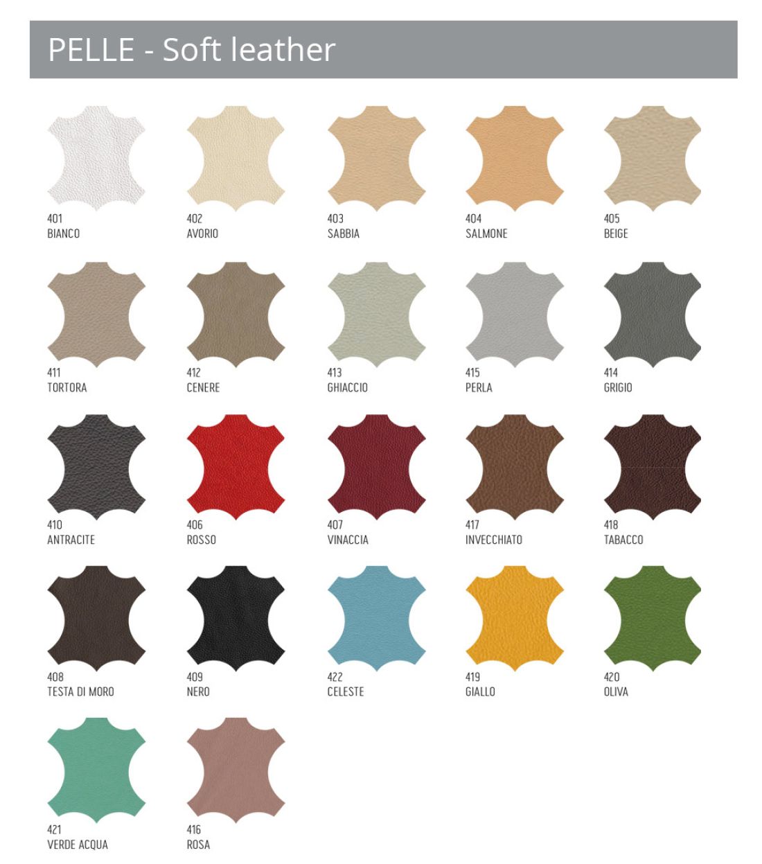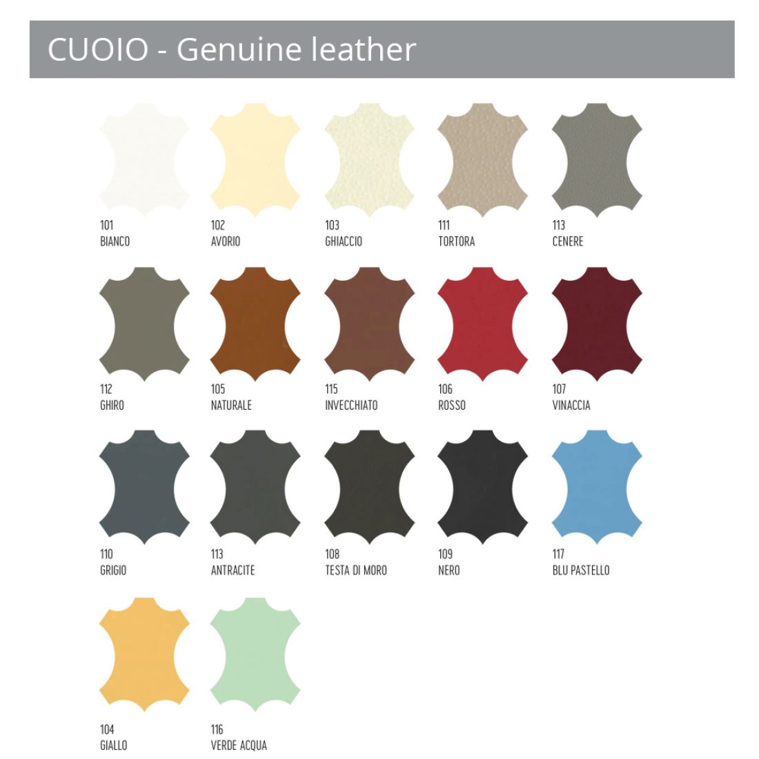 Cuoio pieno fiore naturale: il cuoio pieno fiore al naturale è un materiale privo di ogni colorazione. Evidenzia la sua naturalezza per venature, segni e ombreggiature che in armonia tra loro diventano dei pregi nel susseguirsi del tempo. Estremamente fotosensibile, parte da una colorazione rosa chiaro per arrivare a un rossiccio intenso come il Cognac. Evitare la luce diretta, teme umidità e liquidi.