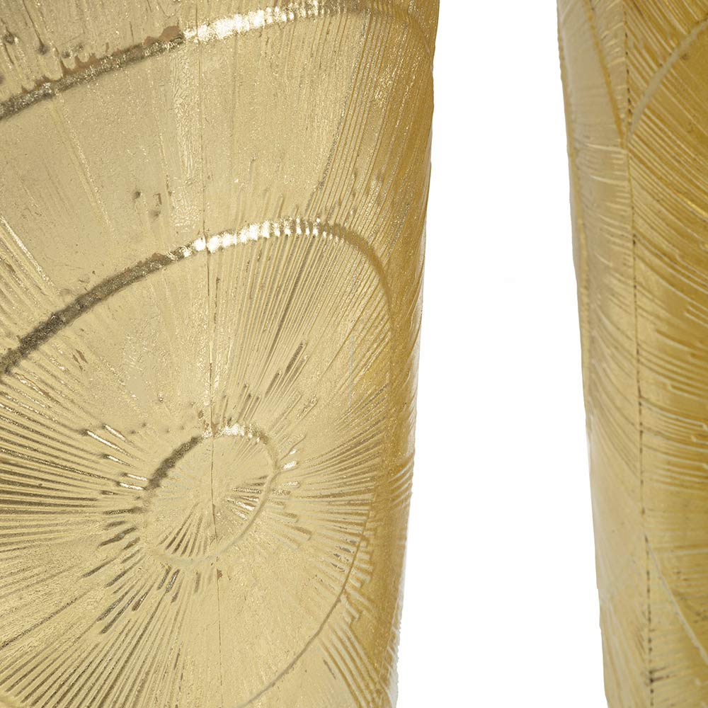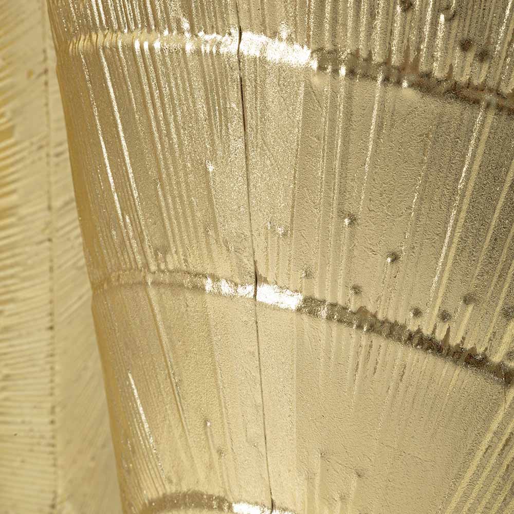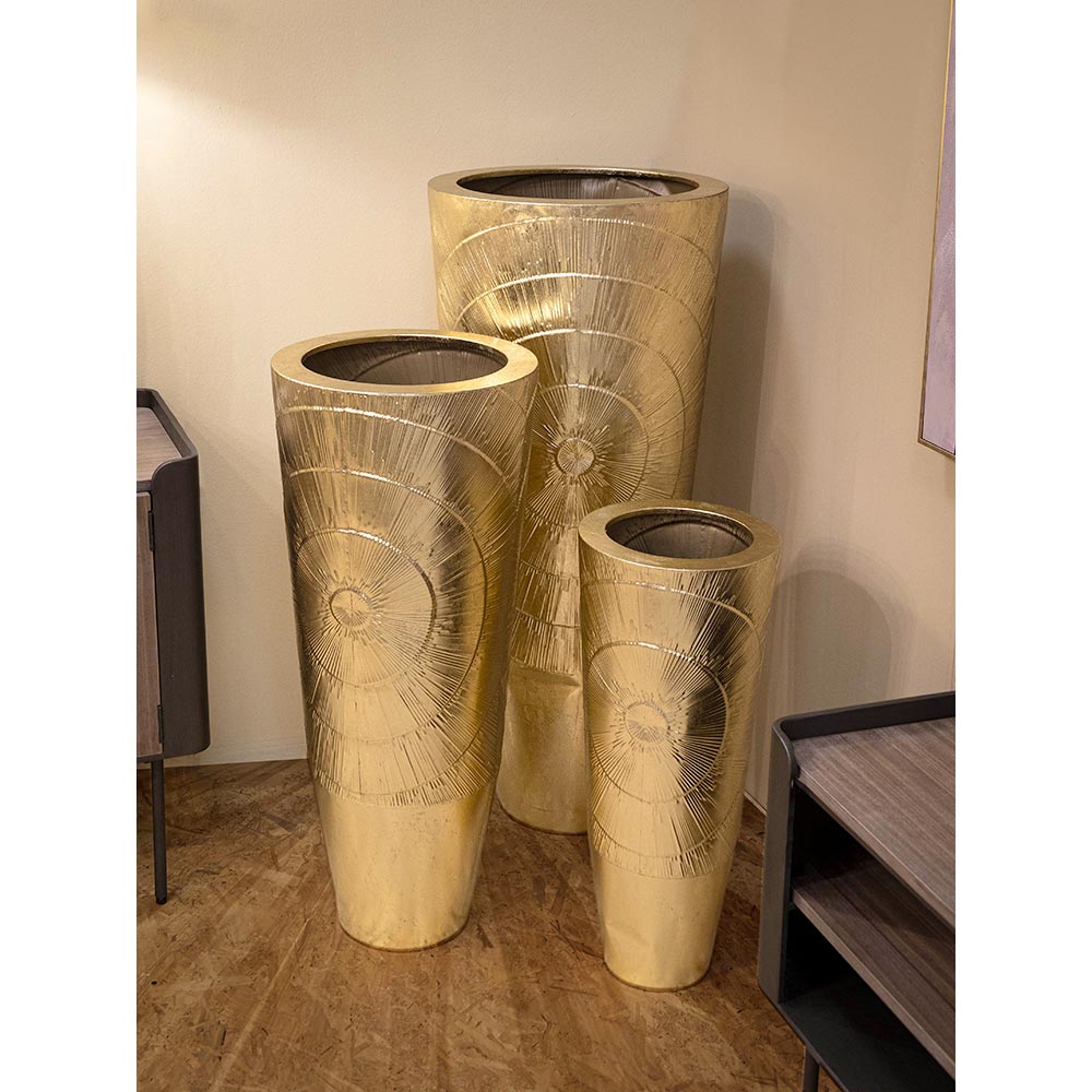 Questi vasi decorativi sono delle vere e proprie sculture, opere d'arte che catturano lo sguardo e arricchiscono con eleganza qualsiasi ambiente. La loro tonalità oro crea un effetto visivo caldo e accogliente, mentre le linee incise nel ferro creano un effetto radiante, che dona movimento e vita alla superficie liscia dei vasi.
