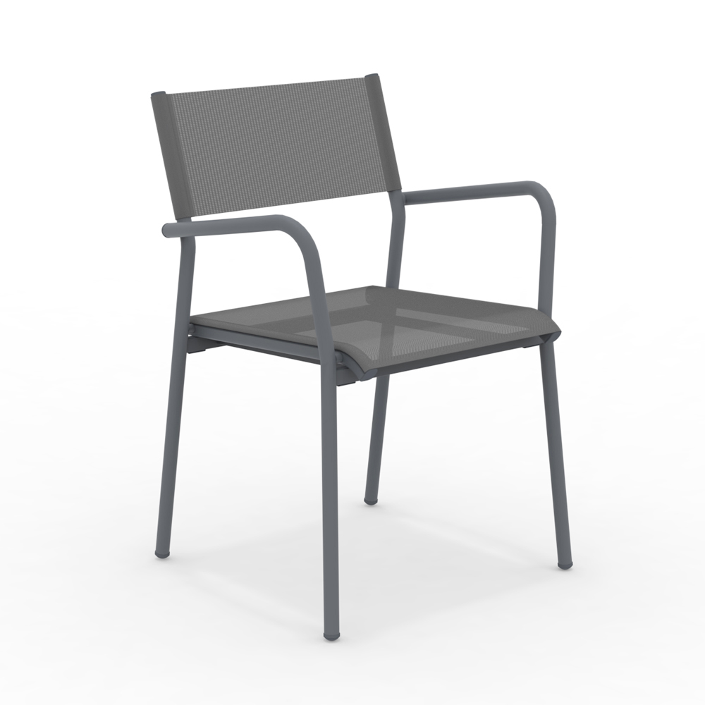 La seduta e lo schienale in batyline offrono un comfort ottimale grazie alla loro traspirabilità e resistenza agli agenti atmosferici, garantendo un utilizzo prolungato nel tempo senza manutenzione. I braccioli integrati aggiungono un tocco di comodità, rendendo questa sedia perfetta per lunghi momenti di relax all'aria aperta.