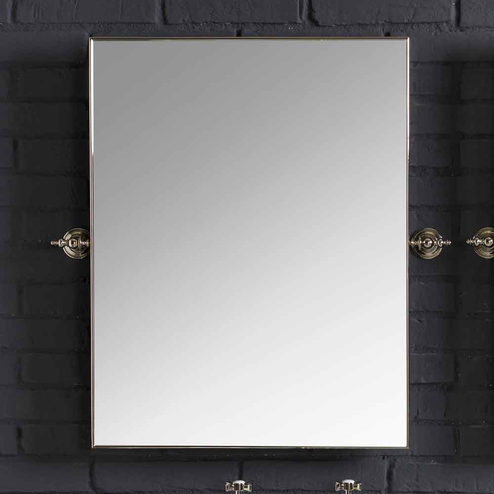 - 2 specchi rettangolari basculanti con cornice metallica in ottone nella finitura nickel lucido. Misure: 76,5 cm x 57,5 cm.