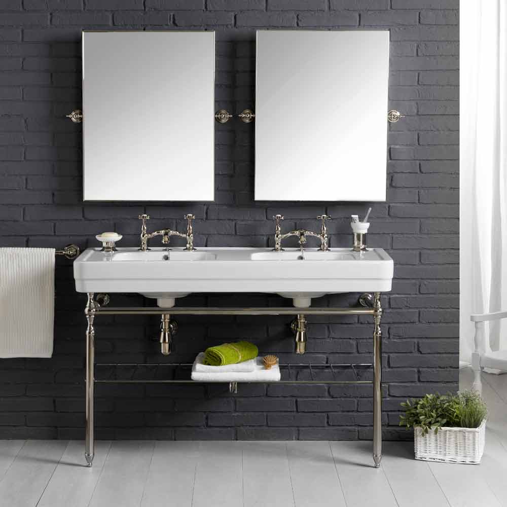 Questa bellissima composizione include un' elegante e spazioso lavabo doppio fissato a muro e appoggiato su una struttura nell'elegante finitura nickel lucido che crea delicati punti luce.