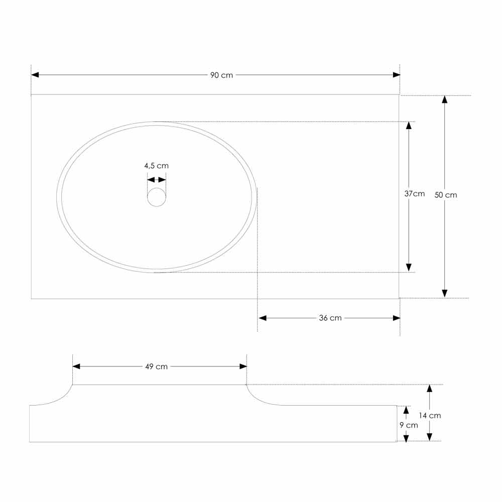 - un top sospeso in solid surface Istone bianco con lavandino integrato con copri scarico di 90x50x10cm (con sistema troppo pieno);