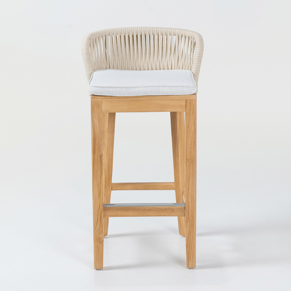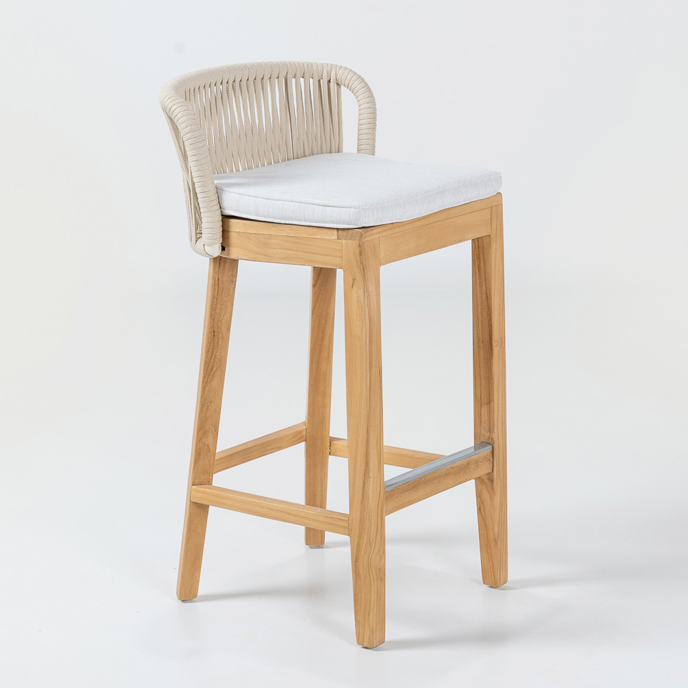 Elegante e versatile, questo sgabello da bar è caratterizzato da una struttura in teak naturale e alluminio, che garantisce una combinazione perfetta di resistenza e leggerezza. Il cuscino in tessuto Havana grey offre un comfort eccellente, mentre l'intreccio in corda Olefin/PP non solo aggiunge un tocco di raffinatezza, ma è anche resistente agli agenti atmosferici, rendendolo ideale per l'uso sia in ambienti interni che esterni.