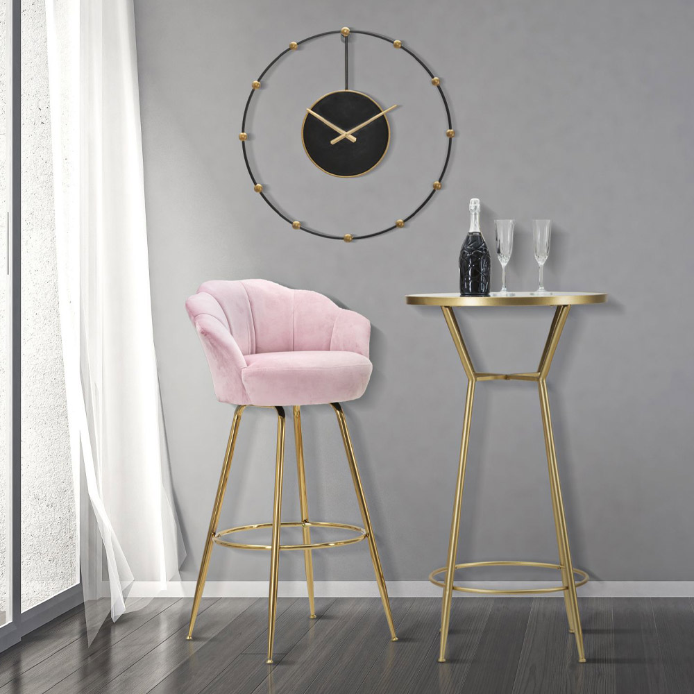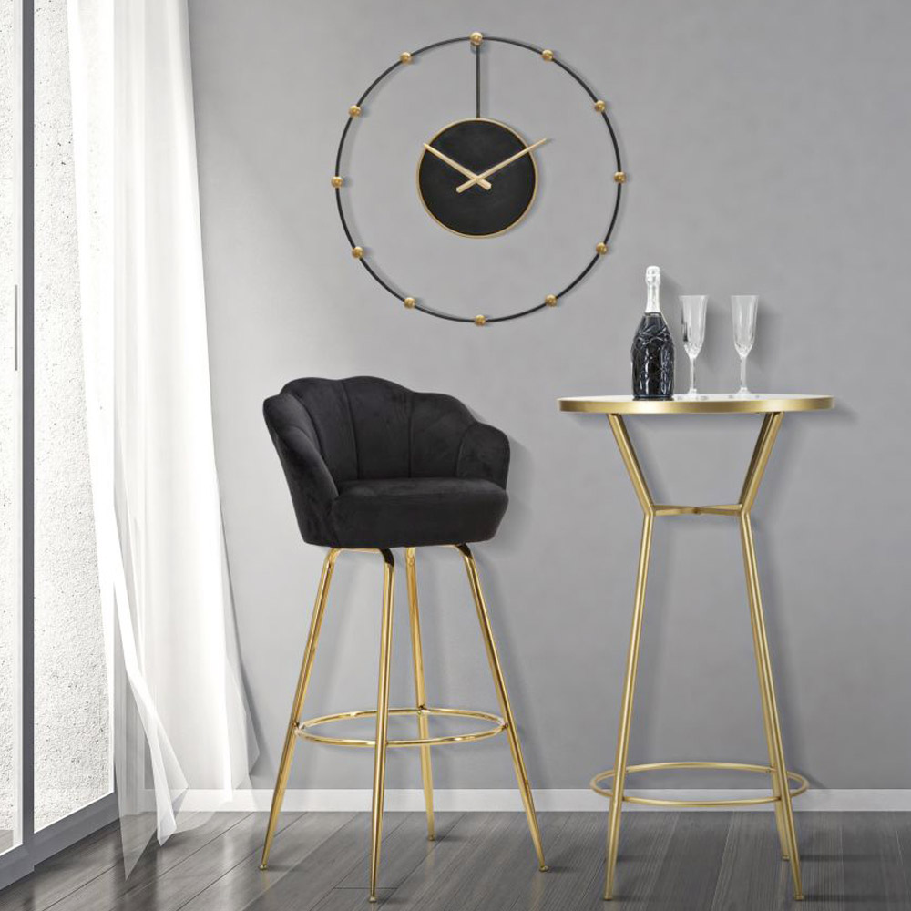 Sgabello bar alto in ferro dorato con seduta rivestita in tessuto.