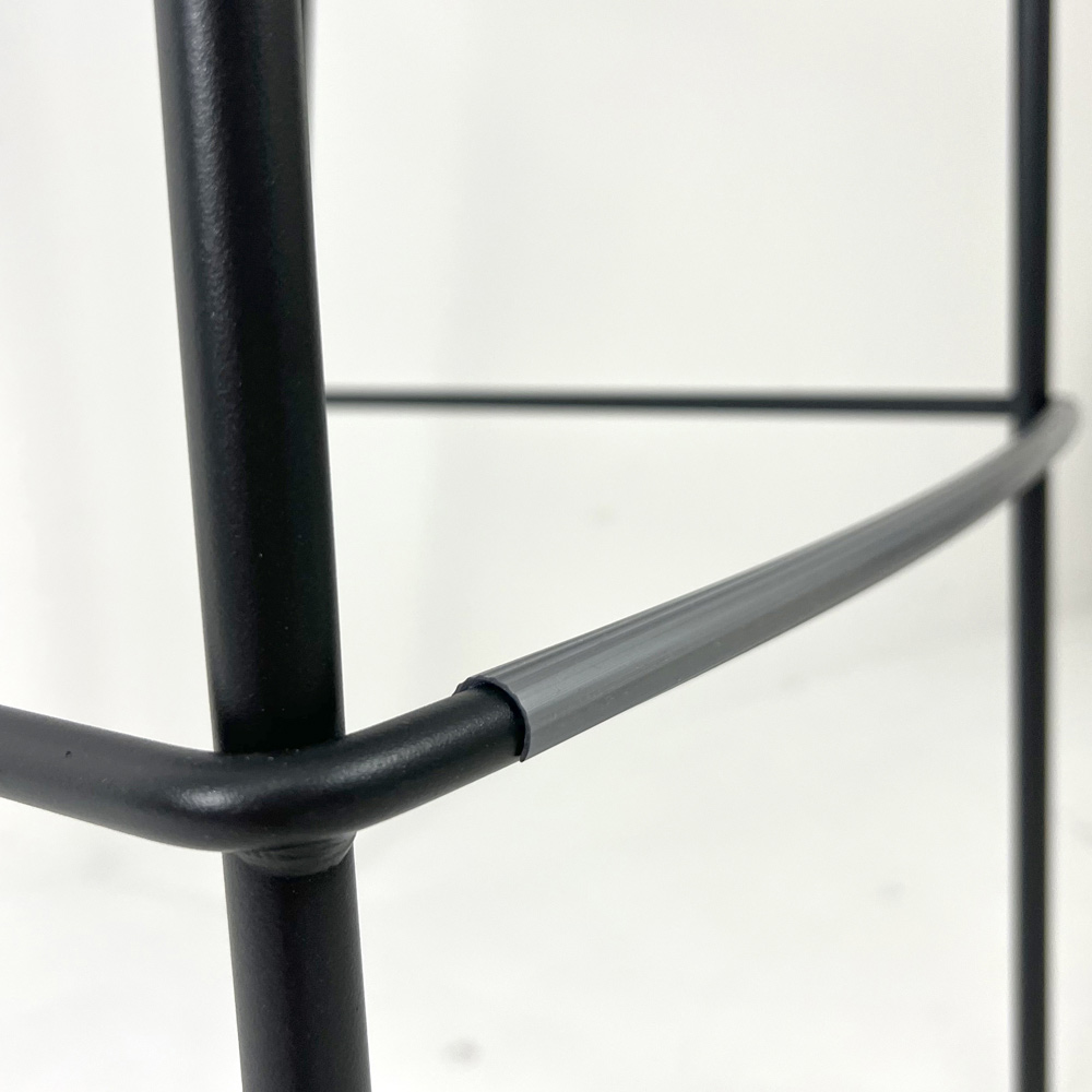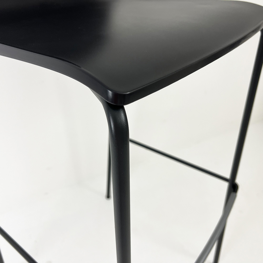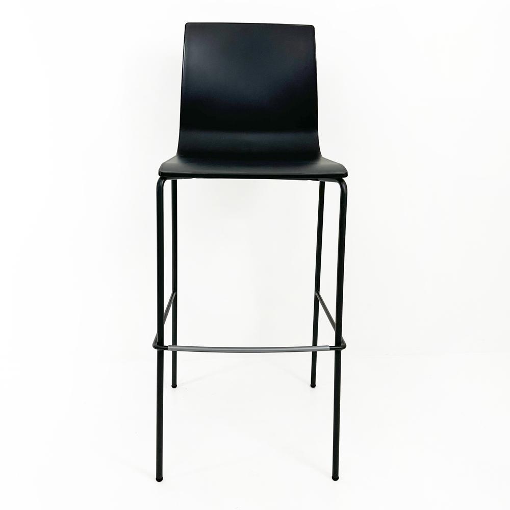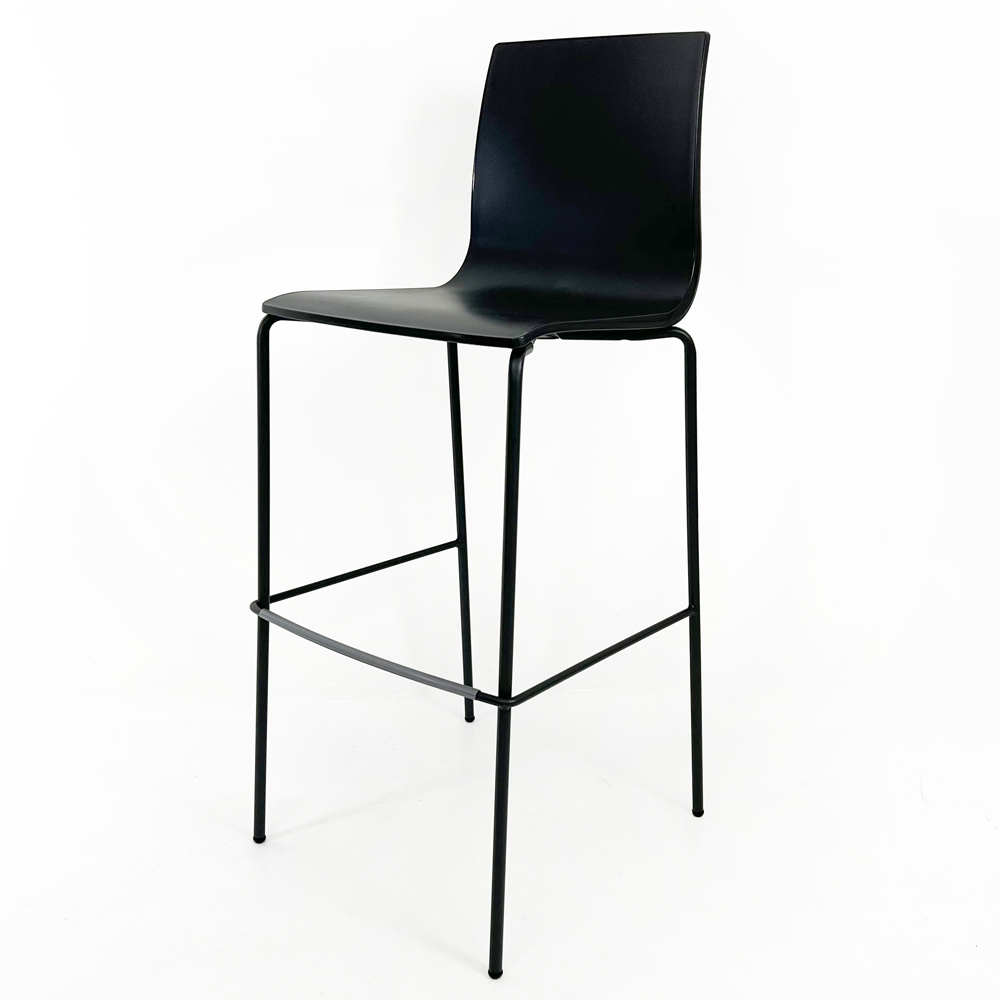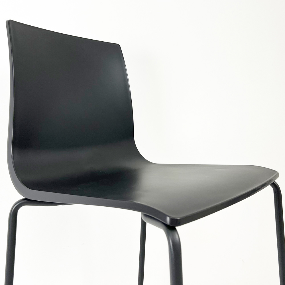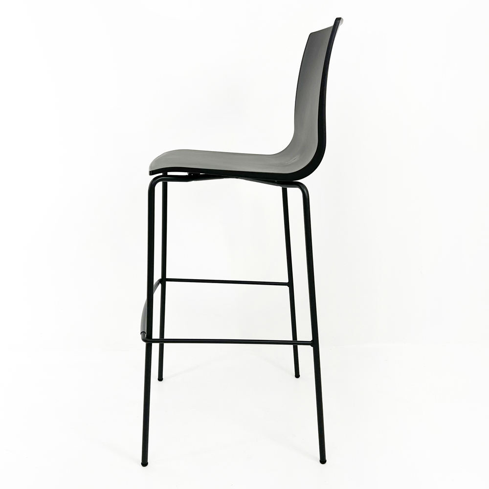 Sgabello moderno Made in Italy composto da una scocca in tecnopolimero riciclabile finitura antracite e dalla struttura a 4 gambe con poggiapiedi in acciaio tubolare in tinta con la seduta del diametro di 16 mm che permette l'impilaggio fino ad un massimo di 4 unità.