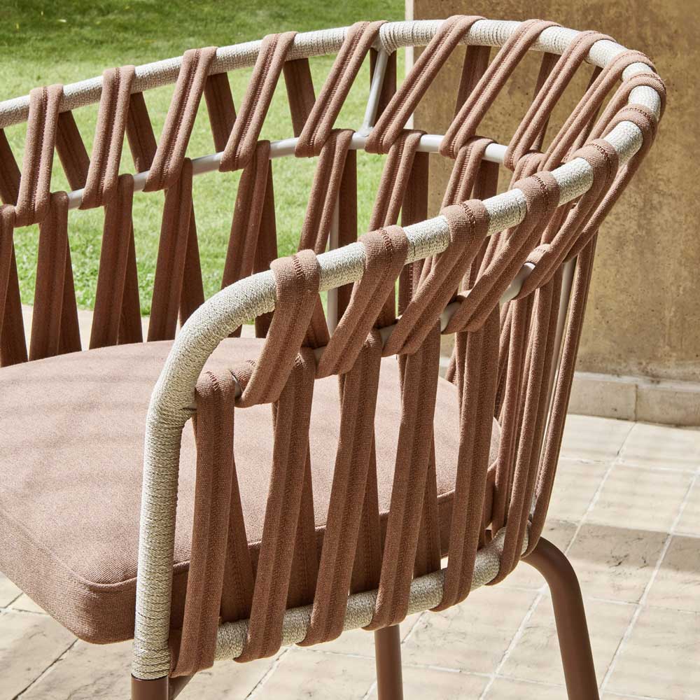 Sgabello da giardino con struttura in alluminio verniciato a polvere epossidica in finitura ruggine, seduta in tessuto sfoderabile color ruggine e schienale in alluminio arricchito da un intreccio di corde in tessuto acrilico nella finitura ruggine, interamente realizzato in Italia. Una soluzione d'arredo innovativa e fresca, ideale per appagare lo sguardo grazie alla sua estetica elegante e moderna offrendo al tempo stesso una seduta accogliente e particolarmente confortevole.