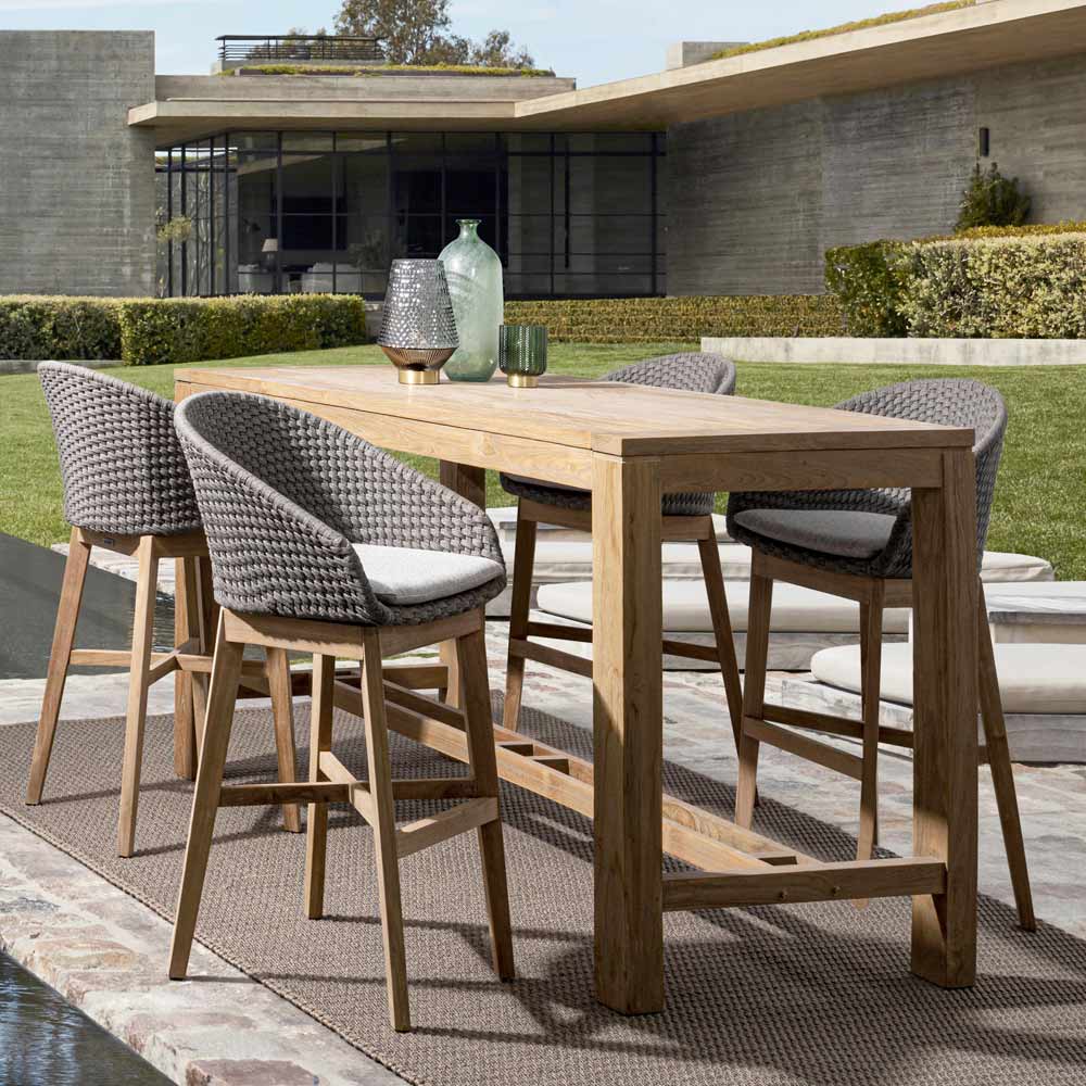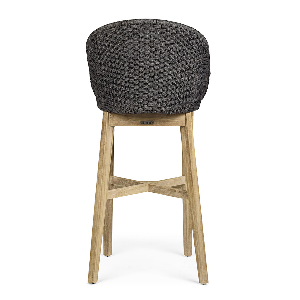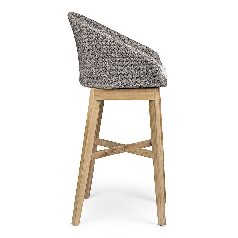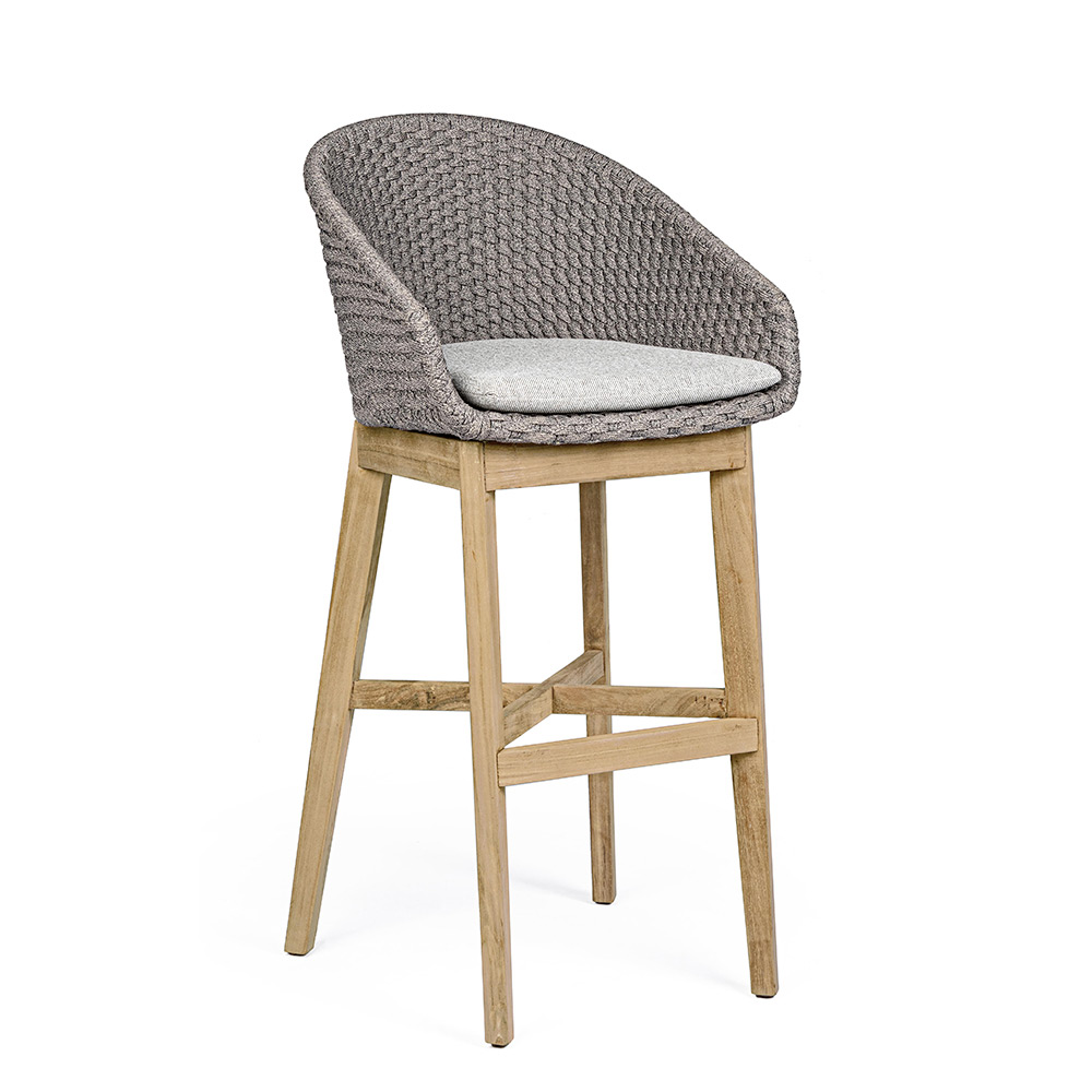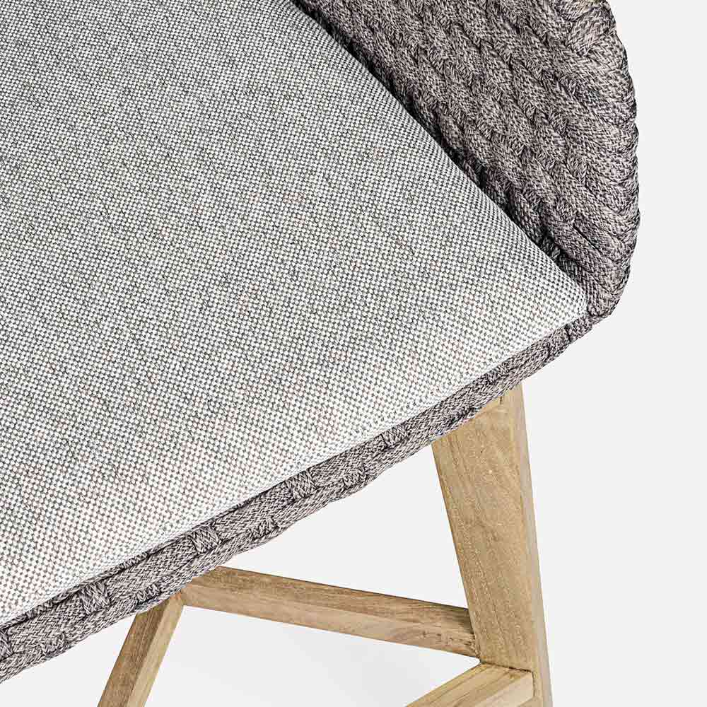 Sgabello alto da esterno di qualità in teak e corda con cuscino in tessuto sfoderabile, 2 pezzi.