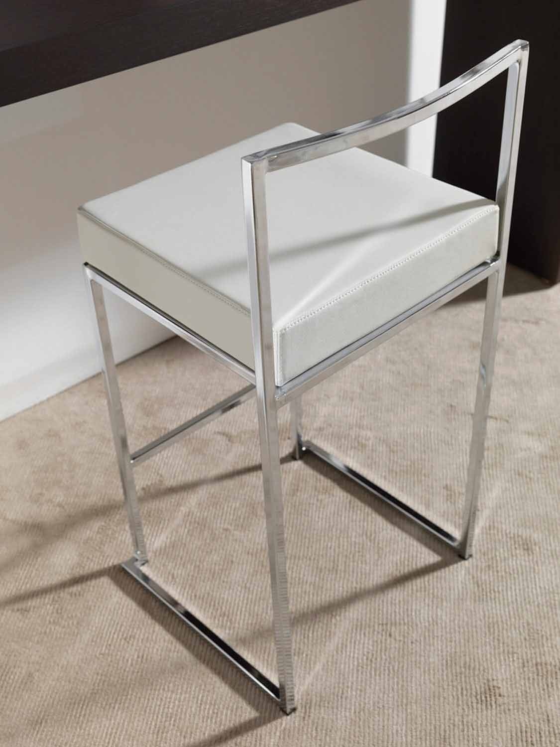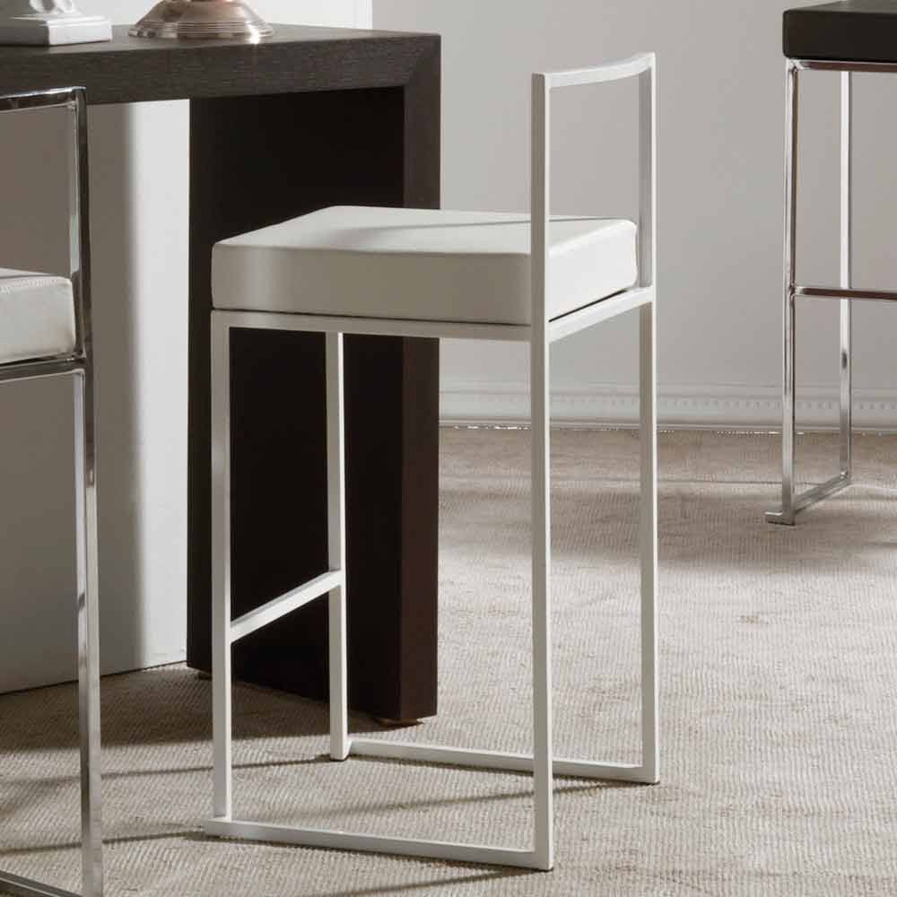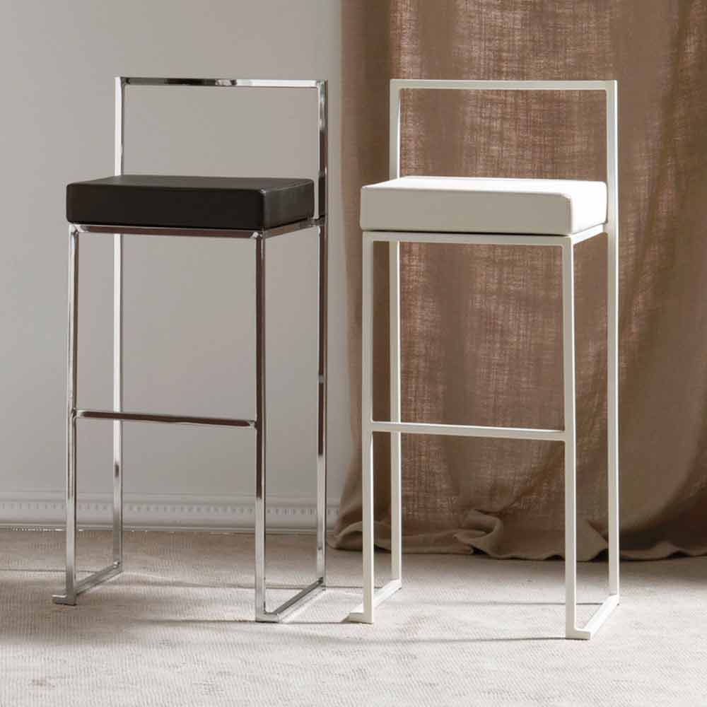 Sgabello di design H 65 cm in acciaio con seduta in ecopelle, con poggia piedi.