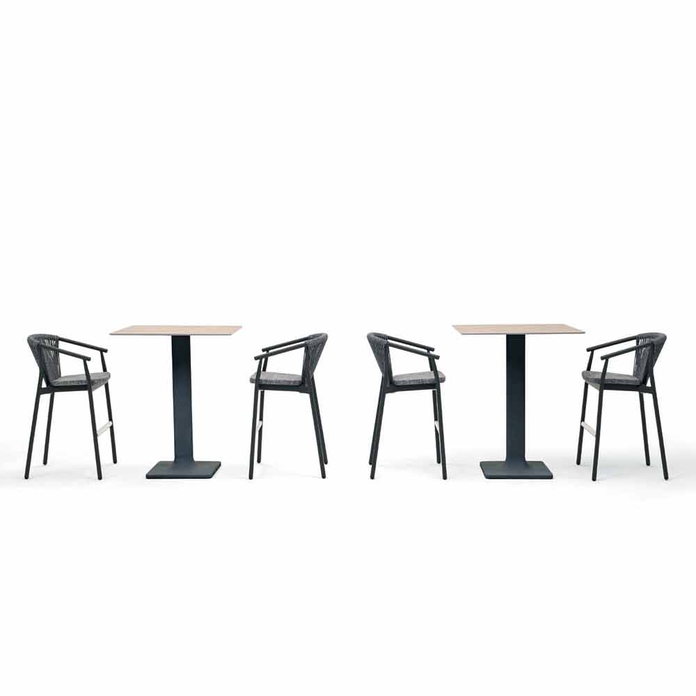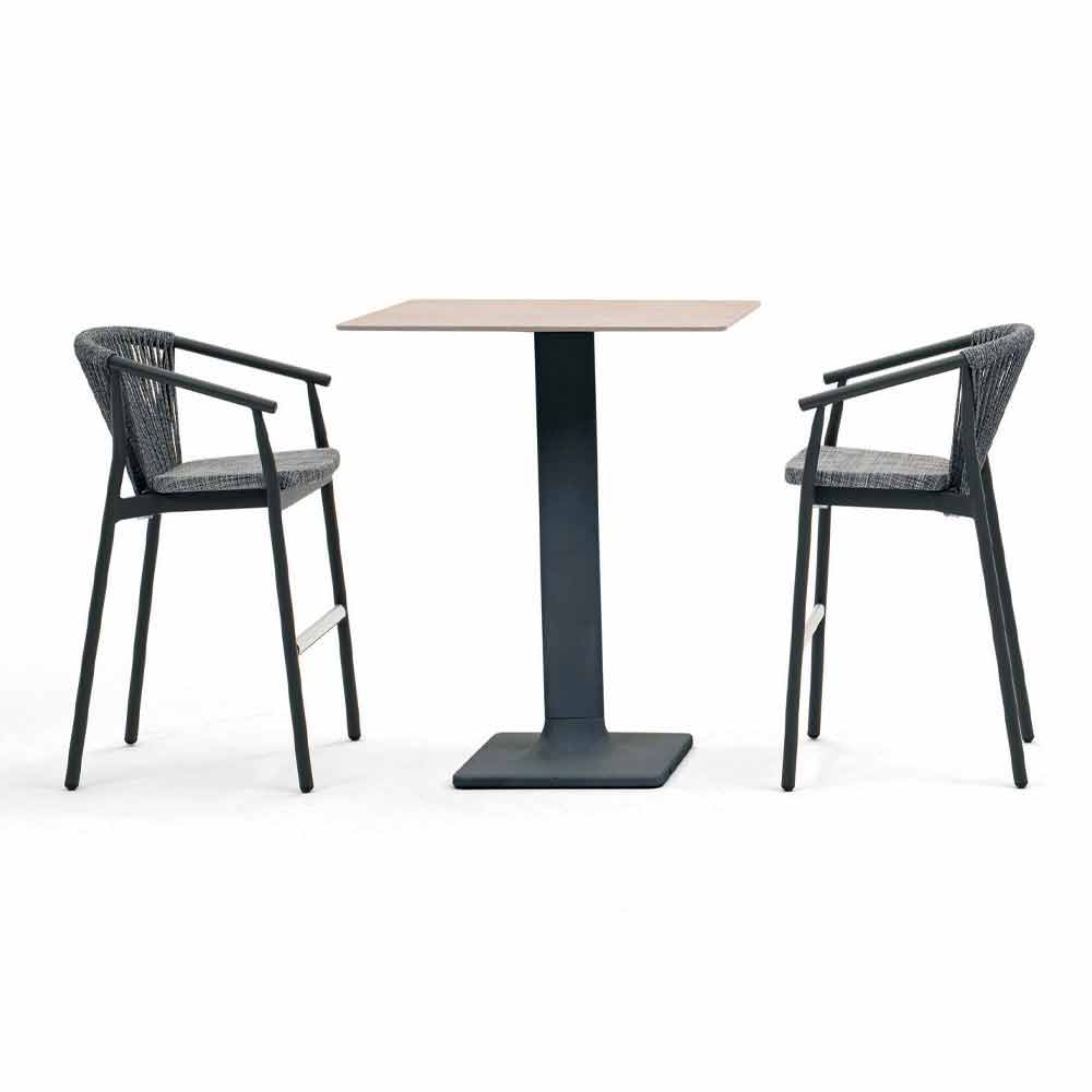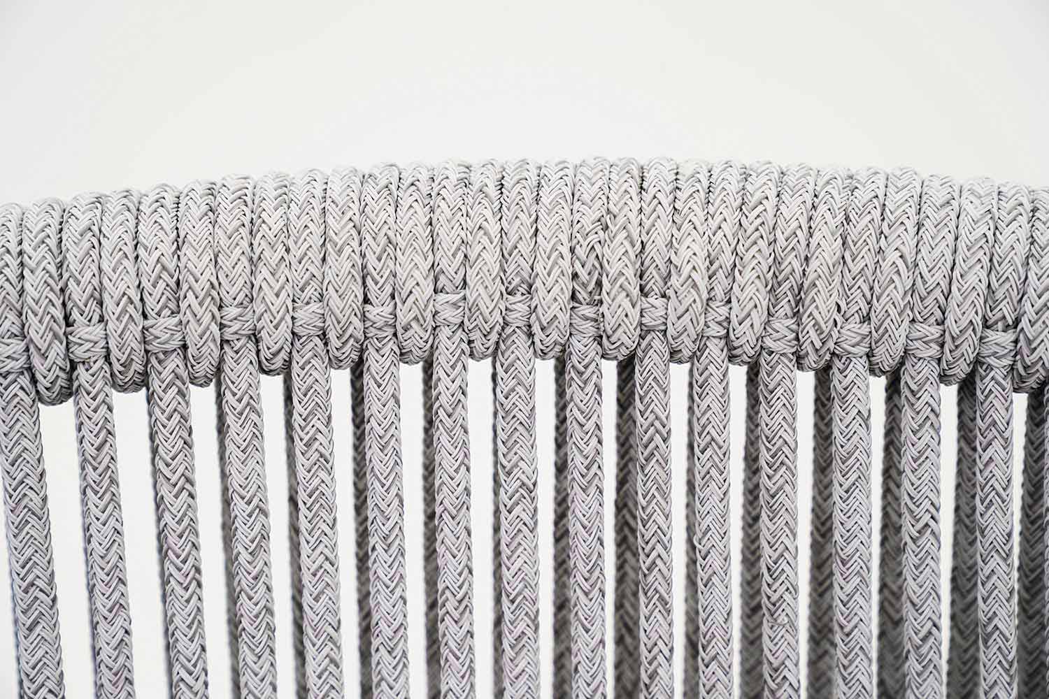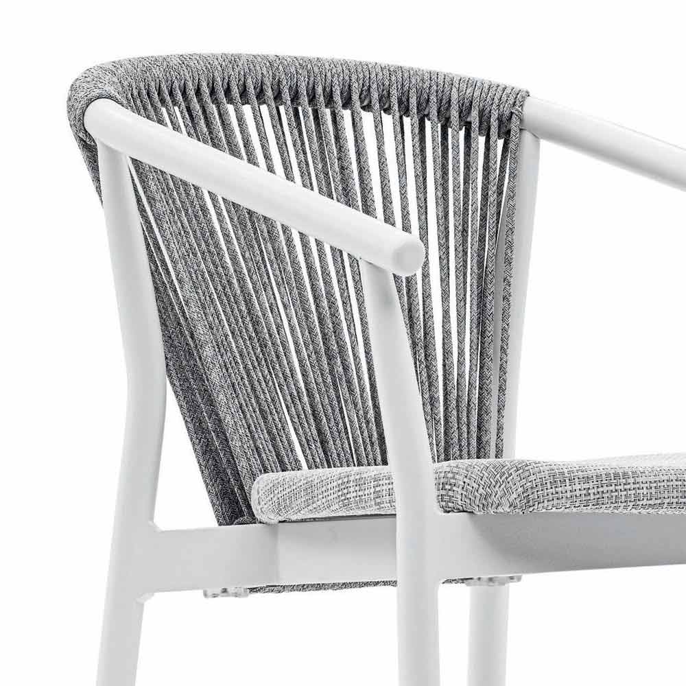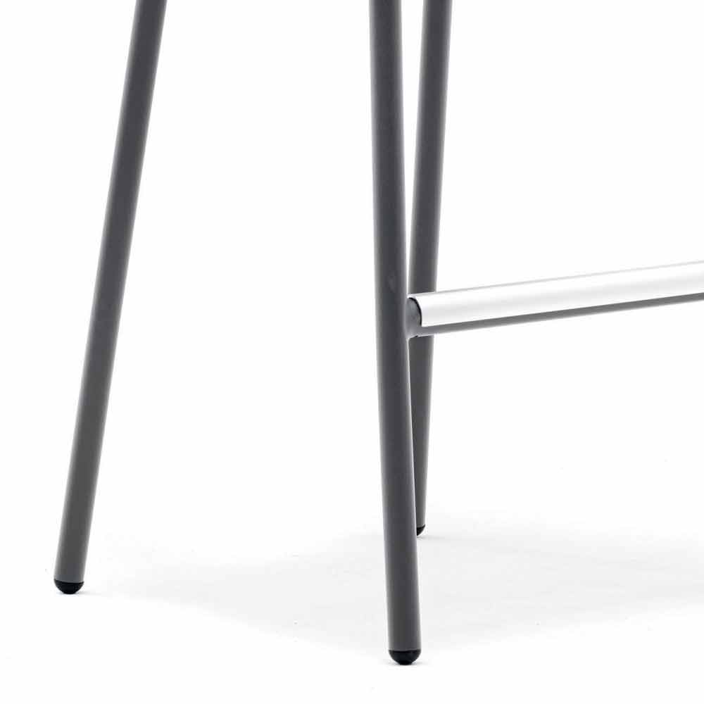 Sgabello di design moderno per esterno impilabile con base in alluminio e seduta in tessuto tecnico colorato bianco o cenere.