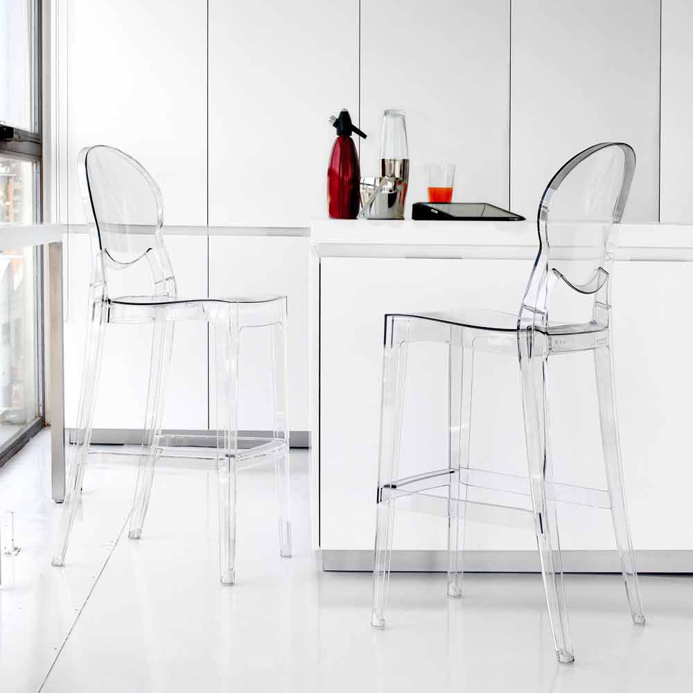 Ciascun sgabello Bosa è costituito interamente in policarbonato trasparente.