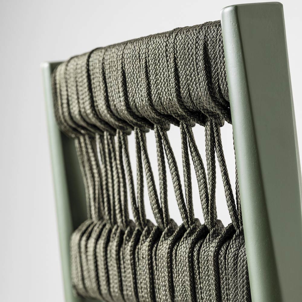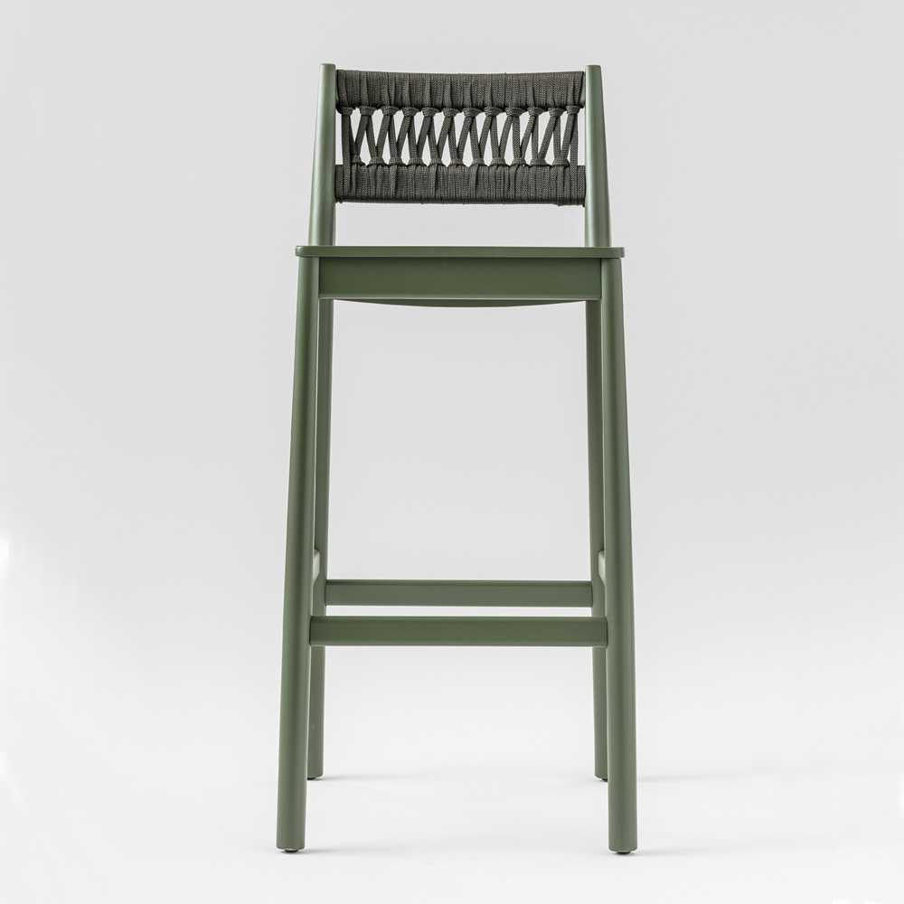 Sgabello alto realizzato in Italia con struttura in legno di faggio laccato e schienale in corda color verde militare. Semplice ma al tempo stesso originale e creativa, questo sgabello racchiude in sè un design tradizionale rivistato per creare un prodotto innovativo e moderno, caratteristiche ottenute grazie alla particolarità dell'intreccio in corda che ricopre l'intero schienale per dare un look nuovo e all'avanguardia. Grazie alla finitura discreta e sobria della struttura si dimostra una seduta estremamente versatile la cui personalità viene decisa dal colore scelto per la corda, riuscendo ad offrire soluzioni sobrie e discrete o stravaganti e colorate.