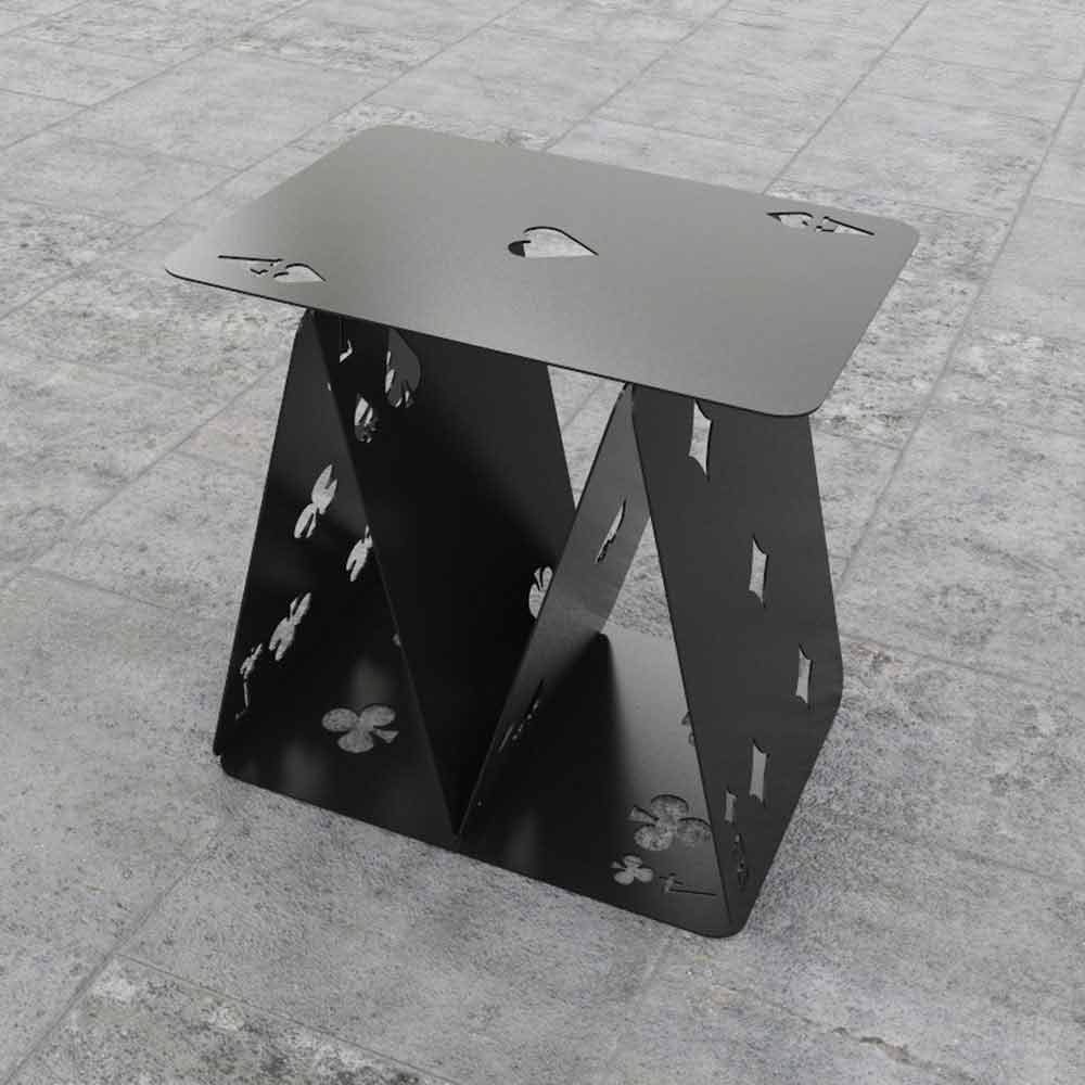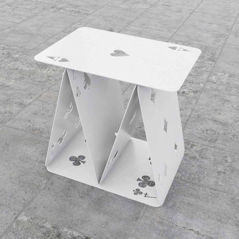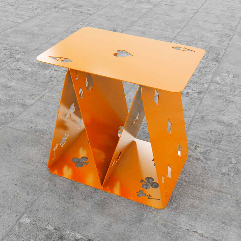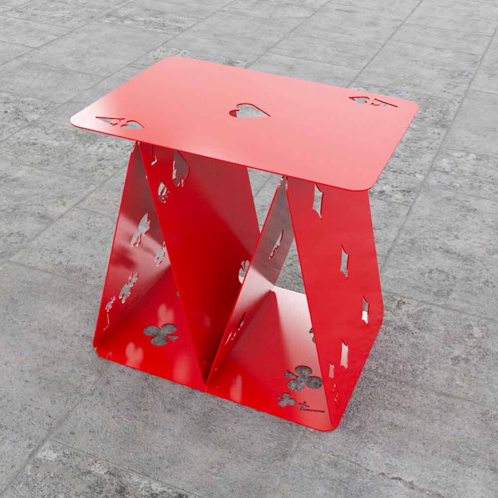 Sei carte colorate in metallo che, disposte secondo il gioco del castello di carte, formano un simpatico sgabello.