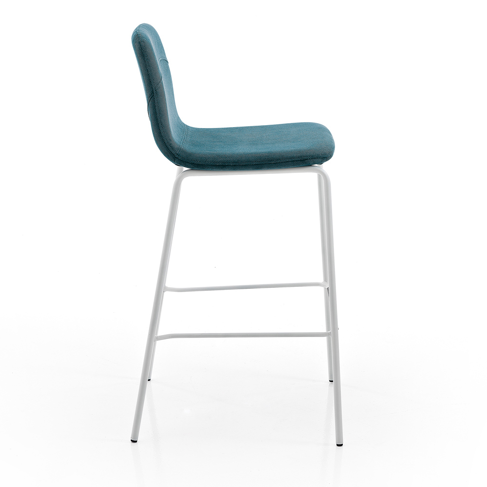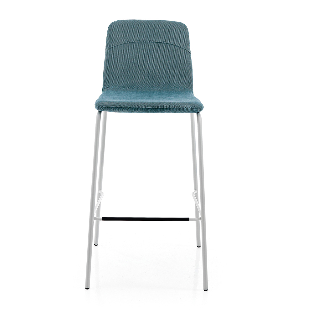 Sgabello alto da cucina realizzato in Italia con struttura in metallo a tubo tondo (diametro 16 mm) completa di pratico poggiapiedi e seduta rivestita in tessuto. Un design funzionale e senza tempo, adatto a coloro che vogliono creare un ambiente accogliente dalle nuance delicate.