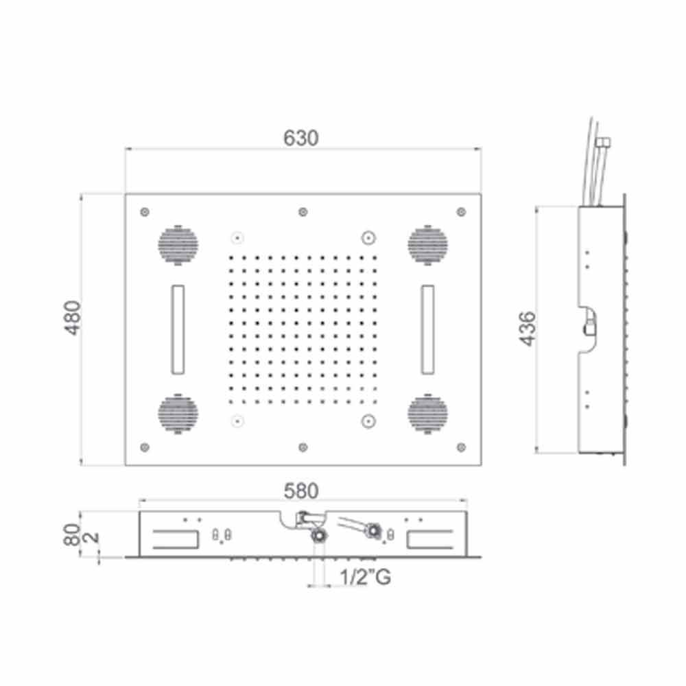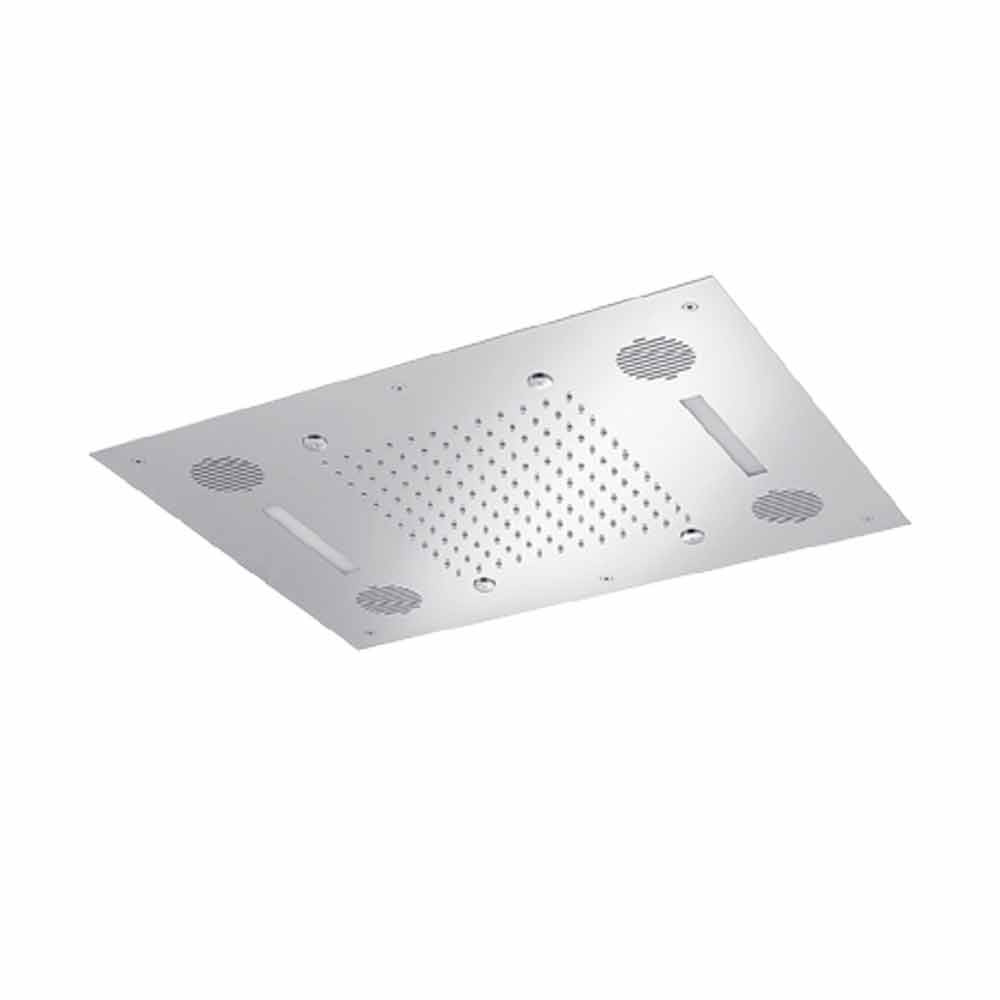 Soffione doccia in acciaio inox con cromoterapia e accesso radio, prodotto di lusso Made in Italy.