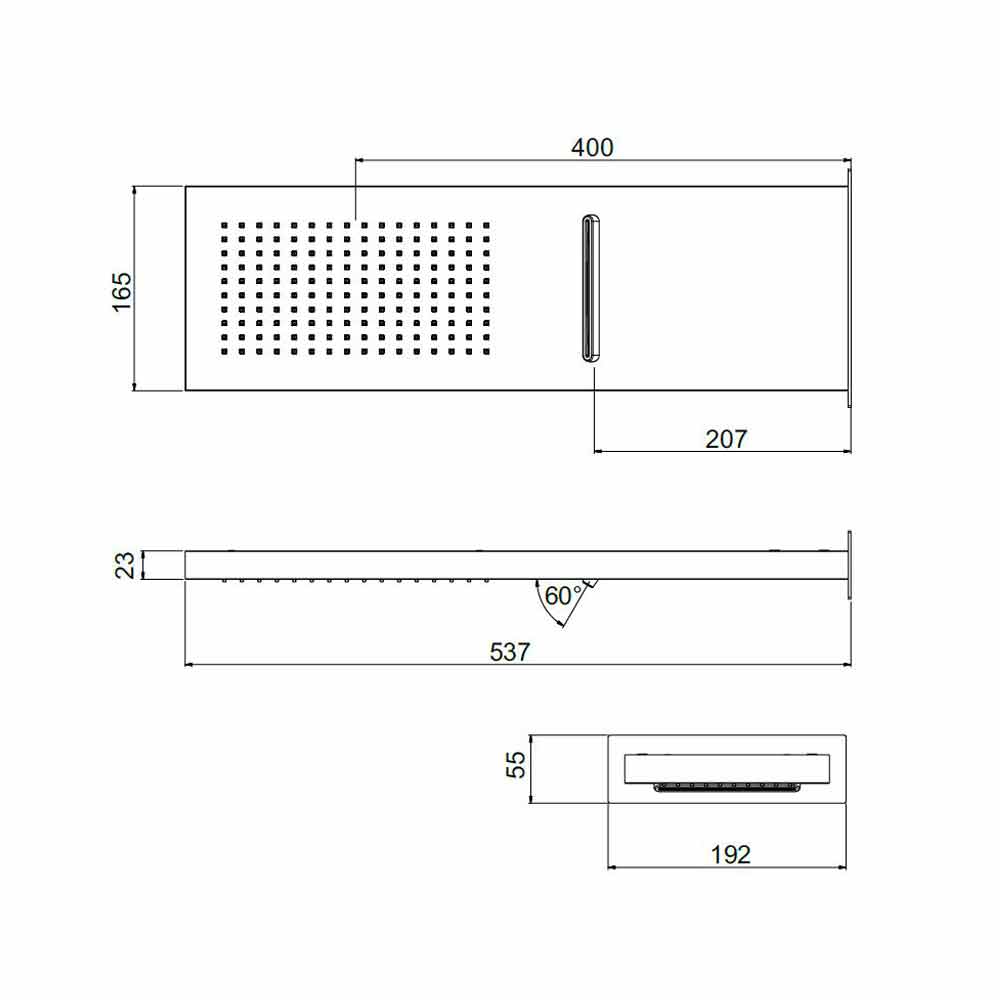 Soffione doccia rettangolare in acciaio inox con doppio getto Made in Italy.
