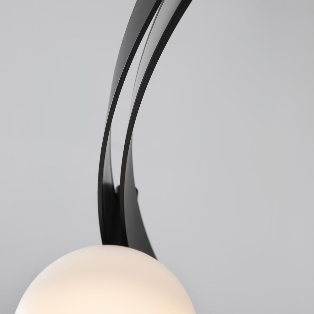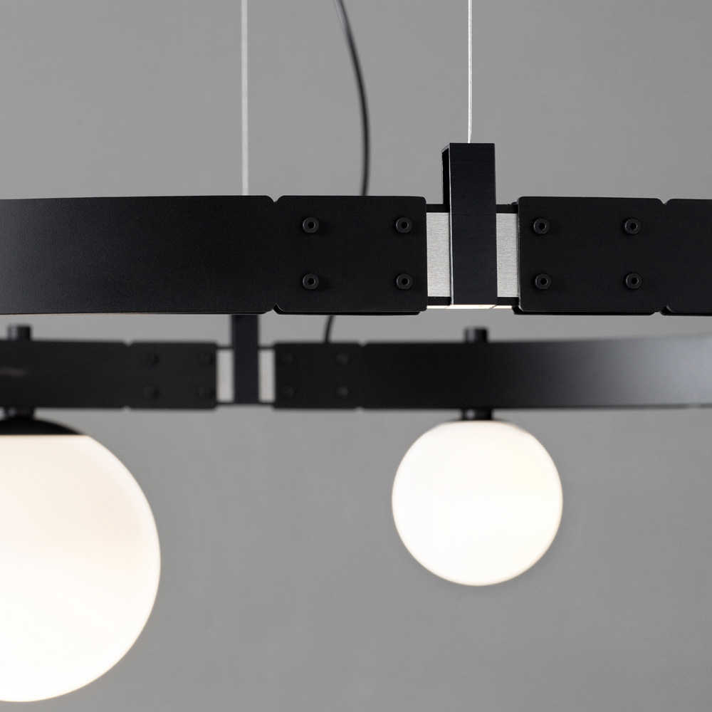 La barra portante ovale richiama le strutture ingegneristiche del passato e le strutture modulari elettrificate sorreggono corpi illuminanti (sfere in vetro soffiato di due diverse grandezze) che possono essere collocati in quantità e disposizione libera, senza l’utilizzo di cavi elettrici di alimentazione, per la massima libertà espressiva.
