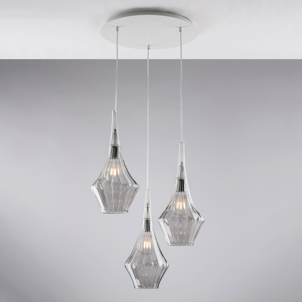 Disponibile nelle finiture Trasparente, Ambra o Grigio, questa sospensione consente di personalizzare l’atmosfera dell’ambiente: luminosa e ariosa nella versione trasparente, calda e avvolgente in ambra, moderna ed elegante in grigio. È ideale per soggiorni, sale da pranzo, cucine con isola, open space e ambienti contract di design.