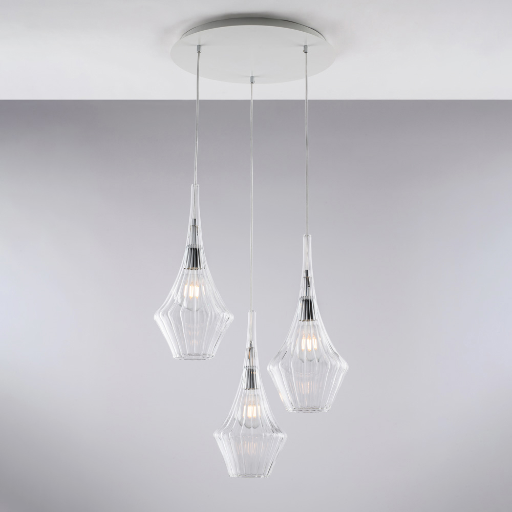 Elegante e luminosa, questa sospensione artigianale in ferro con vetri in Pyrex è una proposta di illuminazione dal gusto contemporaneo e raffinato. I tre diffusori in vetro Pyrex, dalle forme geometriche e sfaccettate, diffondono la luce in modo armonioso creando un effetto visivo leggero e sofisticato.
