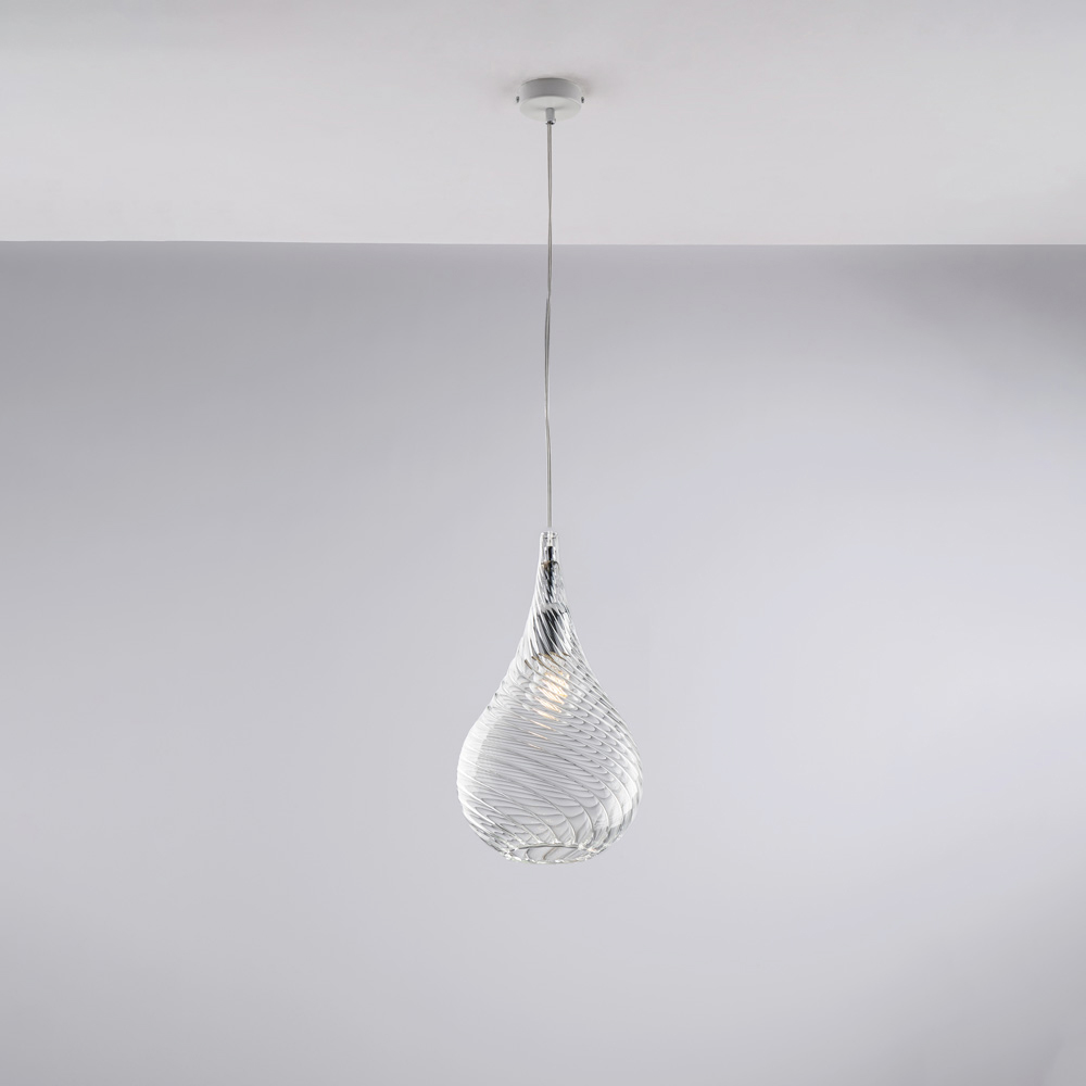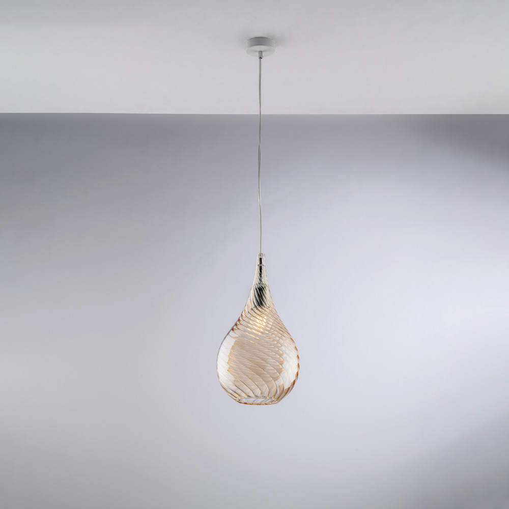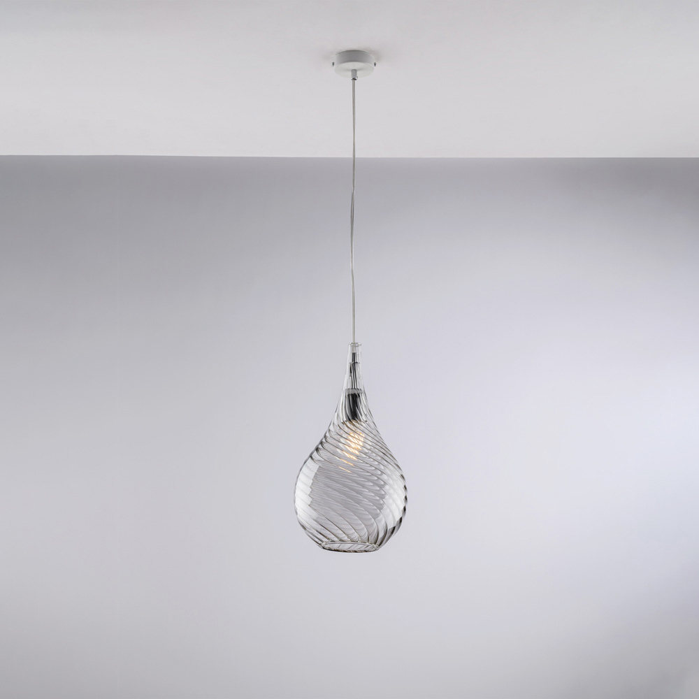 Disponibile nelle finiture Trasparente, Ambra o Grigio, questa sospensione si adatta a diversi stili d’arredo: luminosa e leggera nella versione trasparente, calda e avvolgente in ambra, moderna ed elegante in grigio. Perfetta per cucine, isole, tavoli da pranzo, corridoi, angoli lettura e ambienti contract di design, può essere utilizzata singolarmente o in composizione multipla.