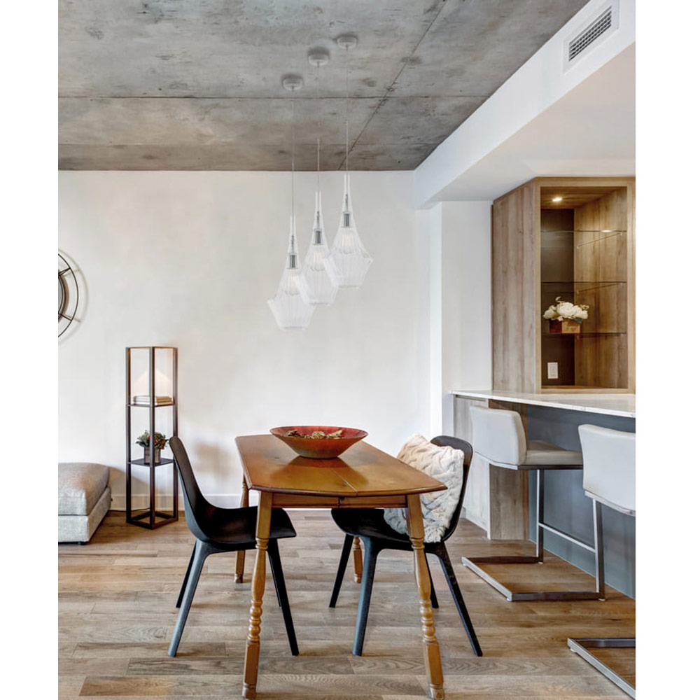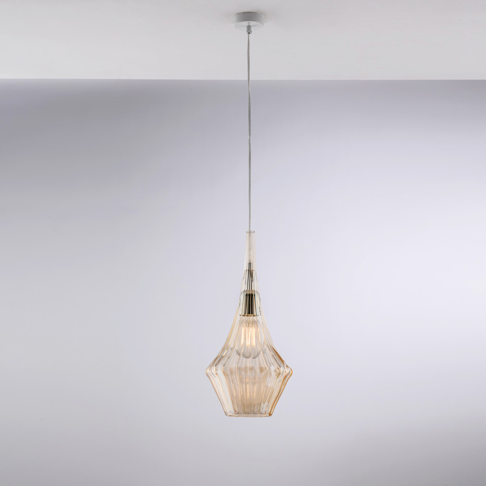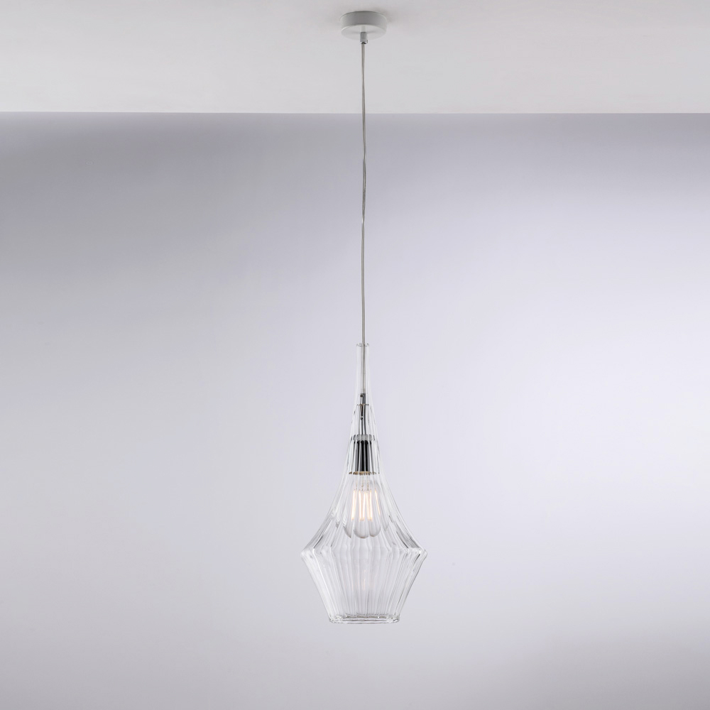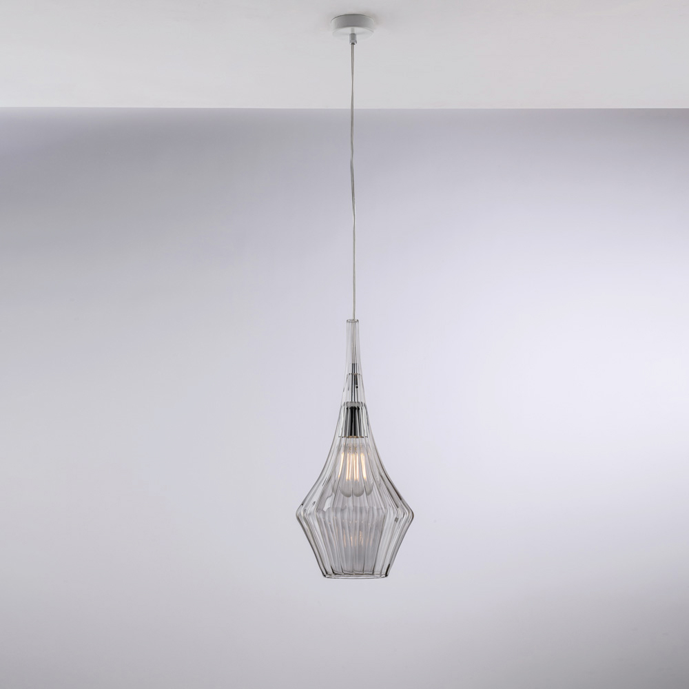 Disponibile nelle finiture Trasparente, Ambra o Grigio, questa sospensione consente di personalizzare lo stile dell’ambiente: luminosa e minimale nella versione trasparente, calda e avvolgente in ambra, moderna ed elegante in grigio. Perfetta per cucine, isole, tavoli da pranzo, corridoi, angoli lettura e ambienti contract di design, sia singolarmente sia in composizione.