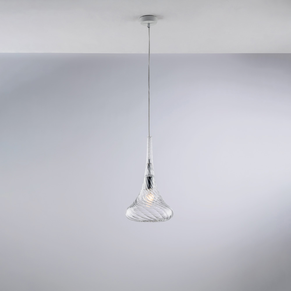 Disponibile nelle finiture Trasparente, Ambra o Grigio, questa sospensione si adatta facilmente a diversi contesti d’arredo: luminosa e minimale nella versione trasparente, calda e avvolgente in ambra, sobria ed elegante in grigio. È ideale per cucine, isole, tavoli da pranzo, corridoi, angoli lettura e ambienti contract di design, sia utilizzata singolarmente sia in composizione.