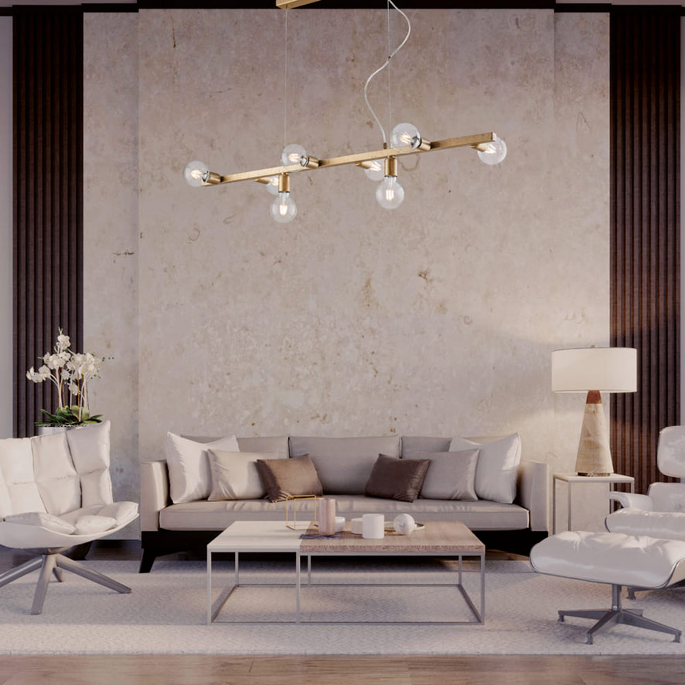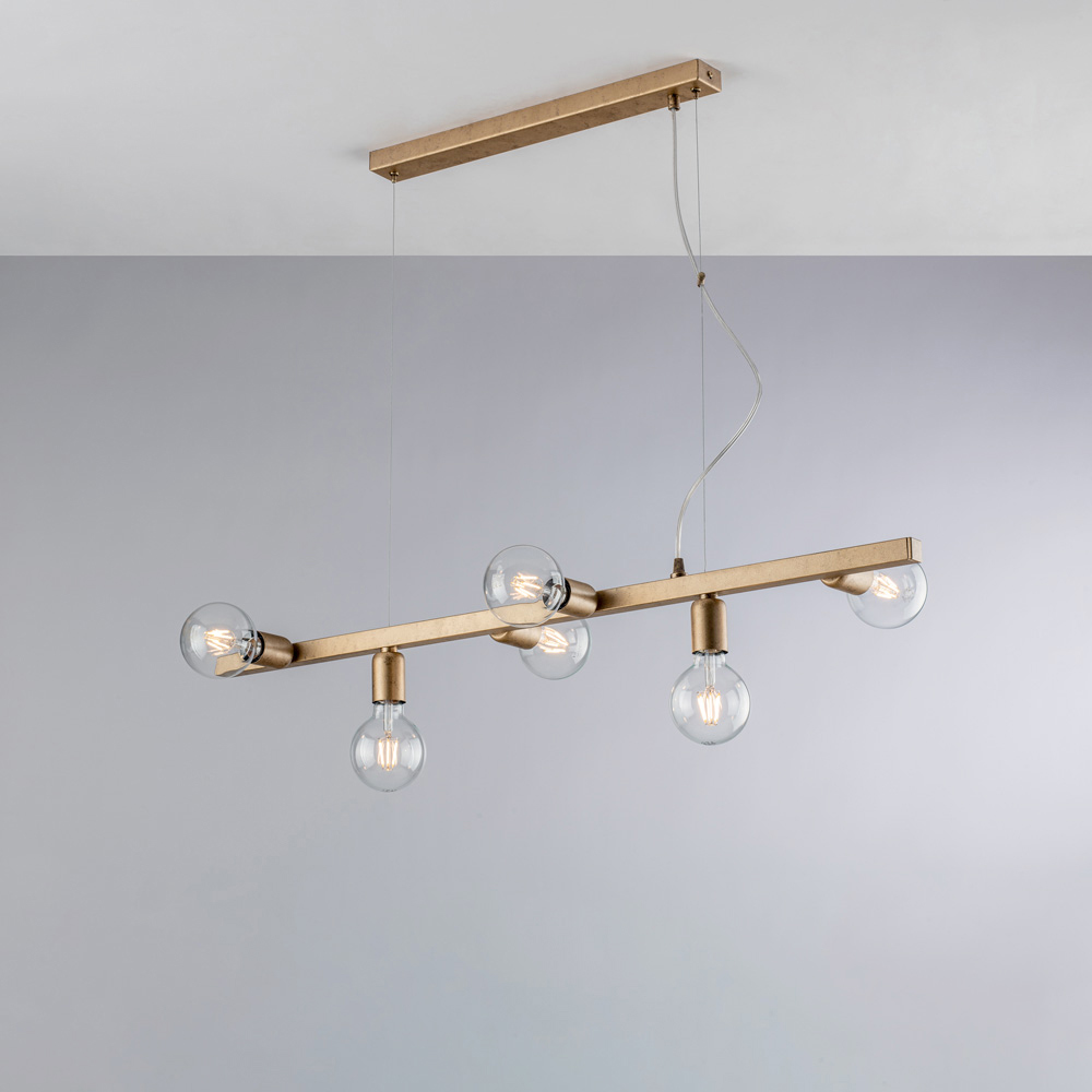 Lineare, moderna ed elegante, questa sospensione di design artigianale in ferro è una soluzione luminosa pensata per ambienti contemporanei e raffinati. La struttura orizzontale, essenziale e ben bilanciata, accoglie diffusori sferici in vetro che garantiscono una luce diffusa, omogenea e scenografica.