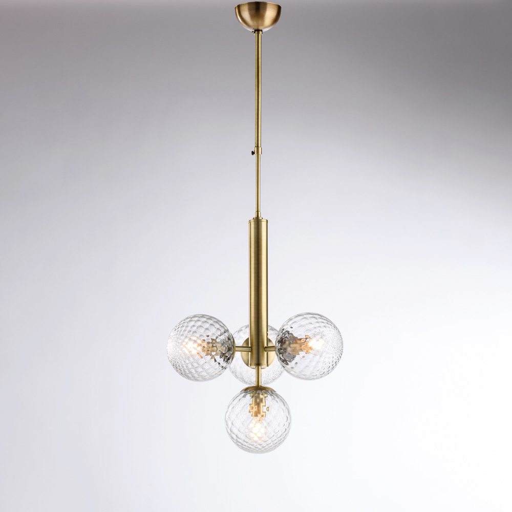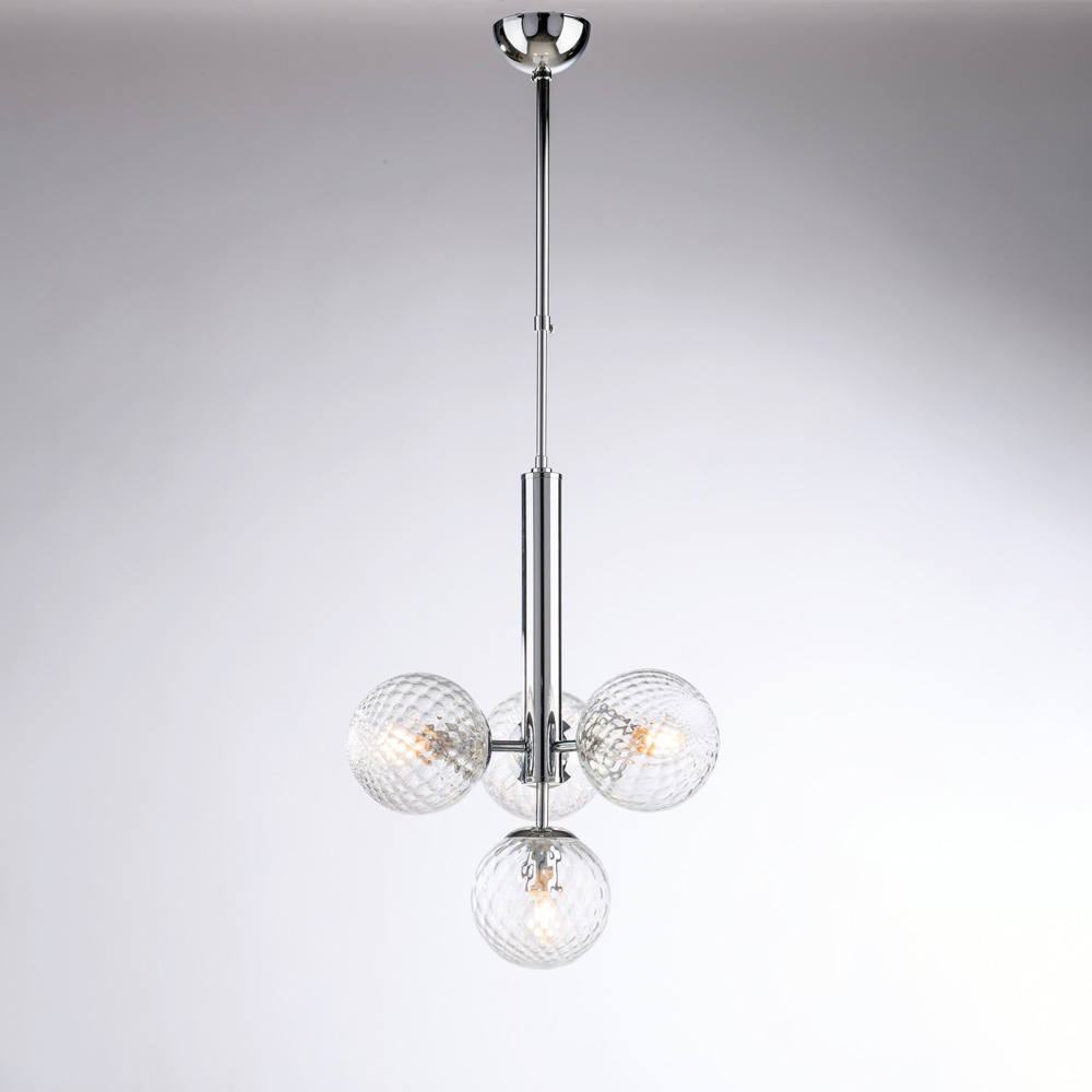 Elegante e dal gusto contemporaneo, questa sospensione artigianale in ferro si distingue per il suo design equilibrato e raffinato. La struttura verticale centrale sostiene quattro diffusori sferici in vetro, creando una composizione luminosa armoniosa che diffonde la luce in modo uniforme e avvolgente.