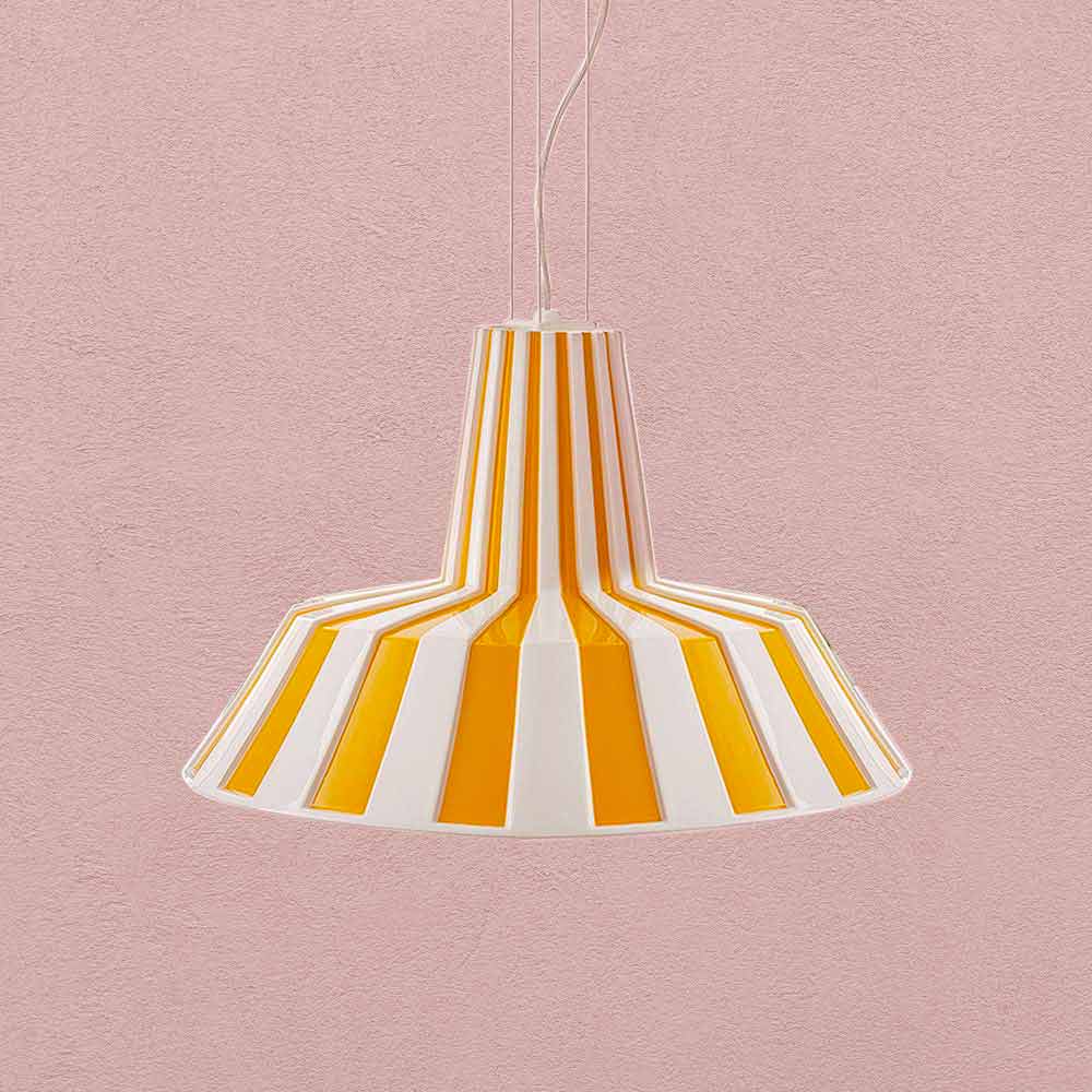 made in Italy ed è realizzata in ceramica, nella finitura bicolore. È inoltre corredata di una parabola interna riflettente e di cavi di sostegno in acciaio inox che permettono la regolazione in altezza al momento dell'installazione.