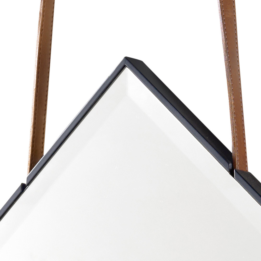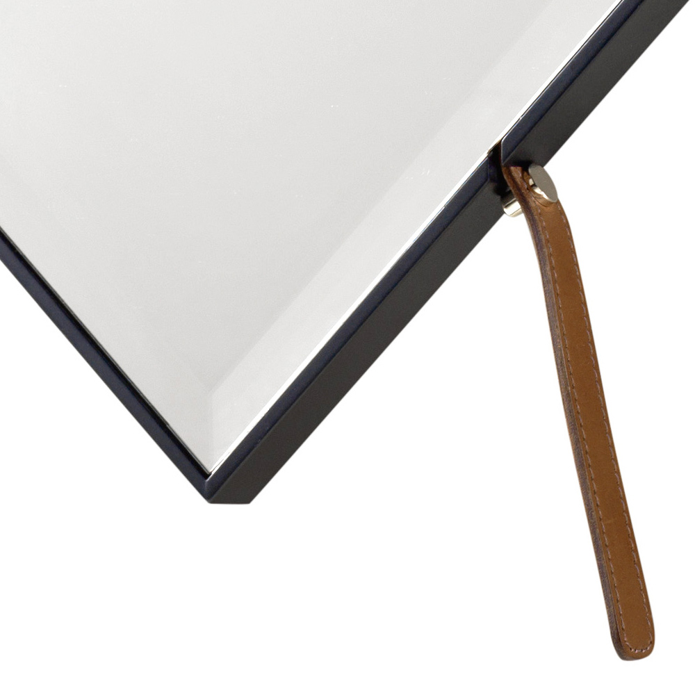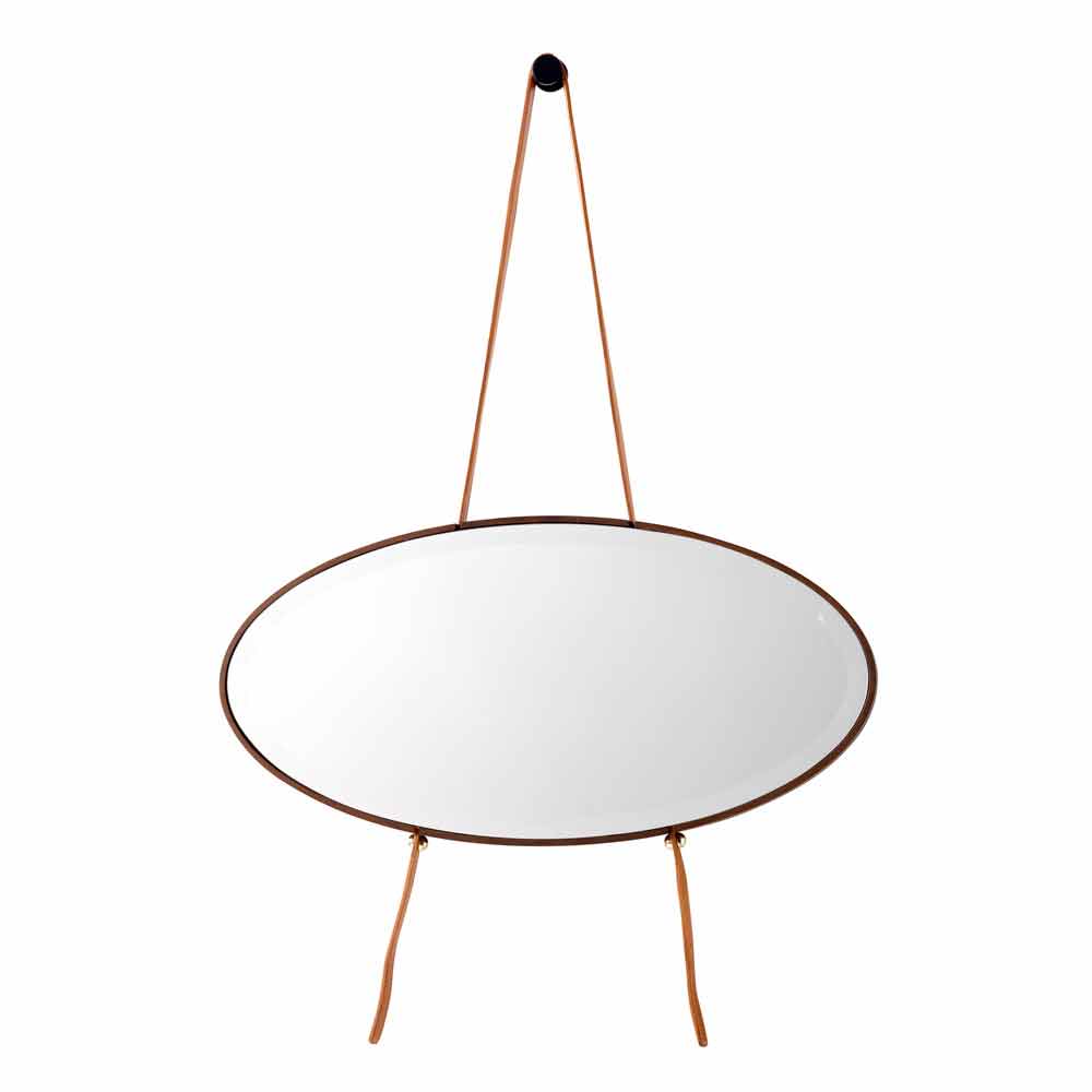 La specchiera York ha un design unico e di stile, realizzata con una struttura in legno massello di noce canaletto e una cintura in cuoio a sostegno che è regolabile in altezza.