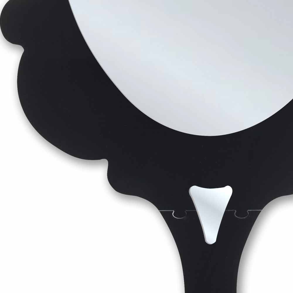 Specchiera con importante cornice in plexiglass nero, in PMMA da polimero vergine 100% dalla fiabesca sagoma di uno specchietto da borsetta, ma dalle dimensioni di un grande "specchio delle mie brame". Il plexiglass è antiurto, indeformabile, inalterabile e termoisolante.La luminosità e la brillantezza si mantengono costanti ed inalterati nel tempo. Il plexiglass PMMA da polimero vergine utilizzato è atossico, ipoallergico, inodore ed antibatterico. Riciclabile 100%.Pensato, progettato e realizzato in Italia, con materiali italiani.