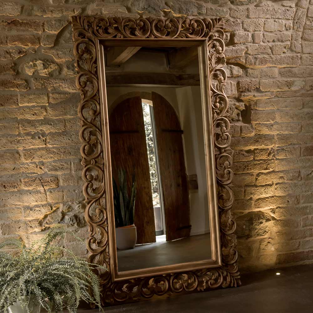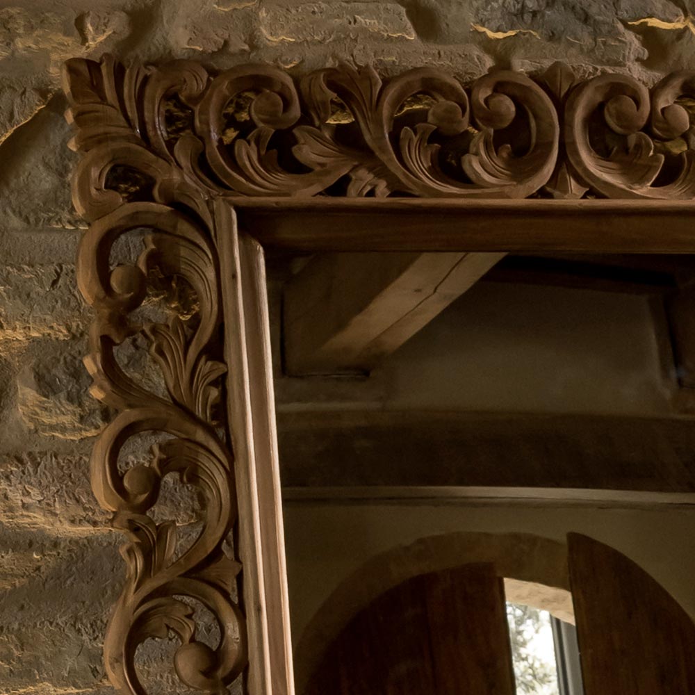 Questa specchiera intagliata in legno massello è un elemento decorativo di grande fascino, capace di valorizzare qualsiasi ambiente con eleganza e personalità. La cornice riccamente lavorata, frutto di lavorazione artigianale, dona allo specchio un carattere unico e senza tempo.