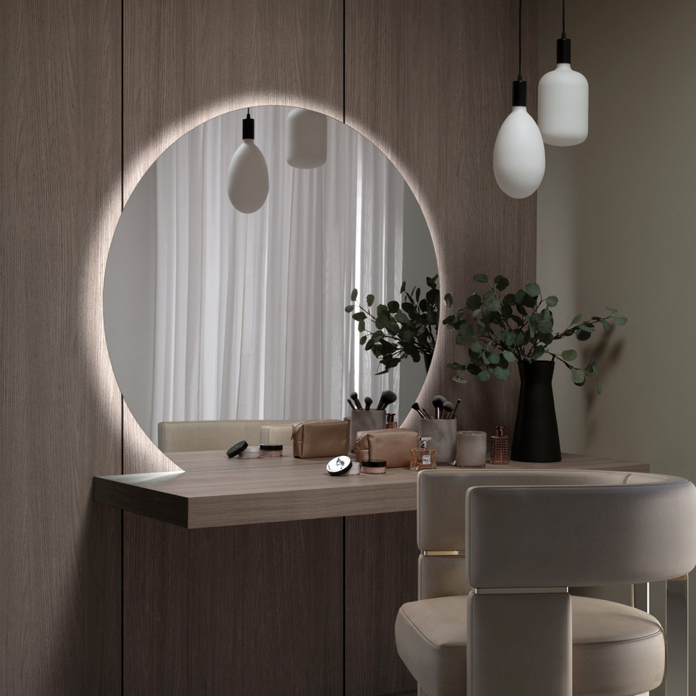 Questo specchio circolare è un capolavoro di design che racchiude in sé eleganza e modernità. La retroilluminazione che ne segue il profilo regala un bagliore etereo e una luce soffusa che esalta ogni ambiente, creando un'atmosfera intima e raffinata. La forma rotonda dello specchio, una scelta di stile senza tempo, riflette e amplifica la luce naturale e la bellezza dello spazio circostante. Perfetto per l'ingresso, il bagno o come punto focale in un salotto, questo specchio con retroilluminazione non è solo un elemento riflettente, ma un vero e proprio oggetto d'arredo che combina forma e funzione, bellezza e luminosità, per un risultato di puro stile e atmosfera.