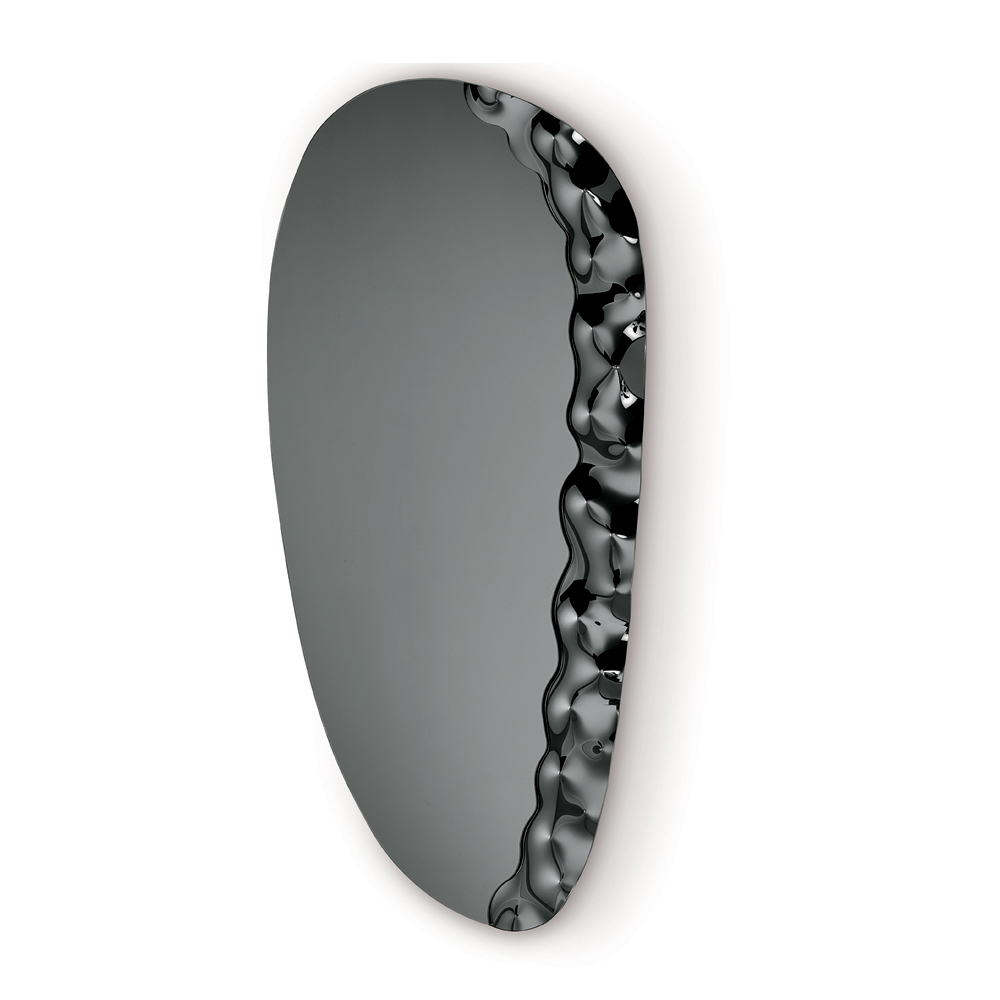 La particolarità dello specchio è la presenza di un inserto laterale in vetro mosso tono su tono, che crea un raffinato gioco di superfici e texture. Questo elemento decorativo sembra fare da base alla lastra specchiata, generando un effetto visivo leggero e sofisticato che dona profondità alla composizione.
