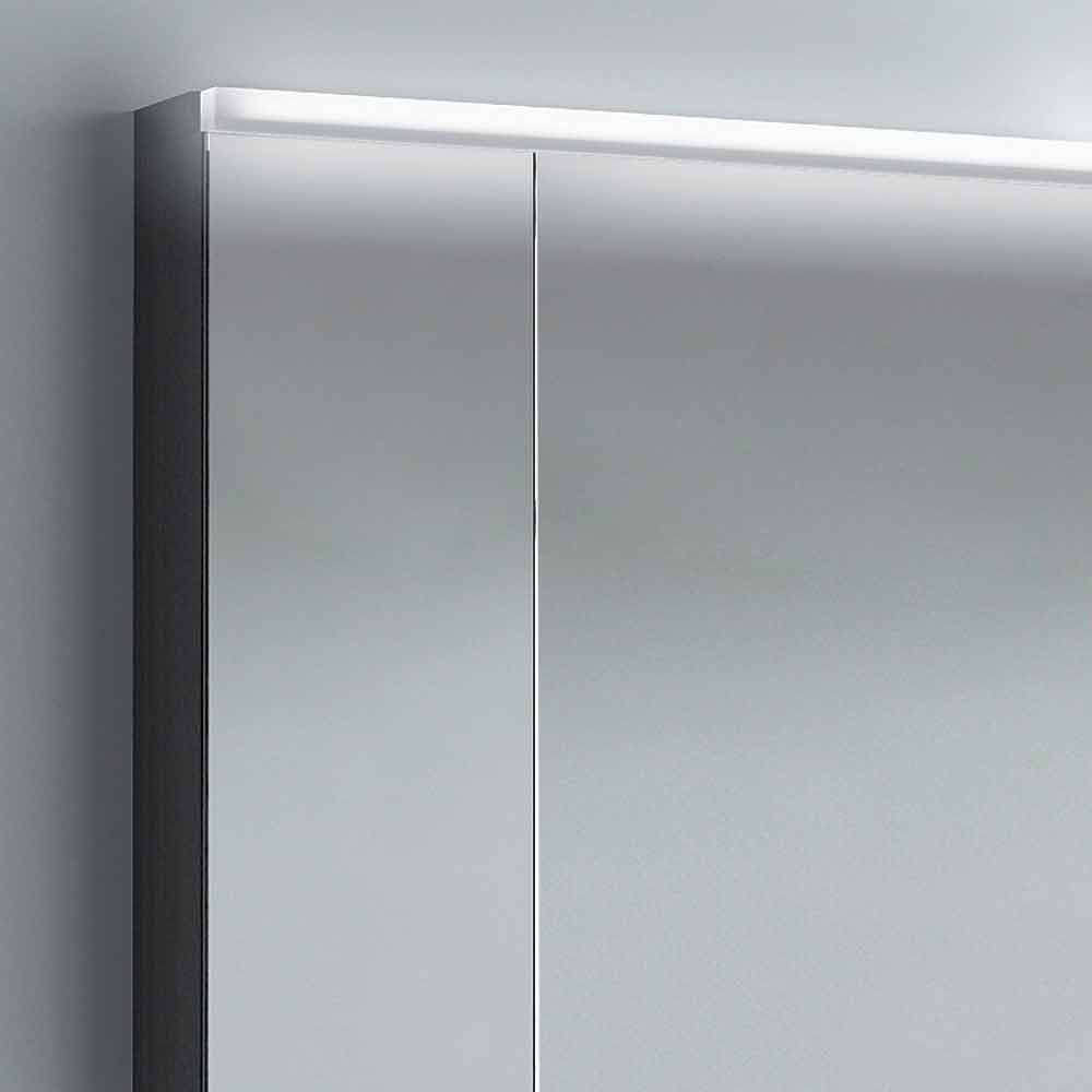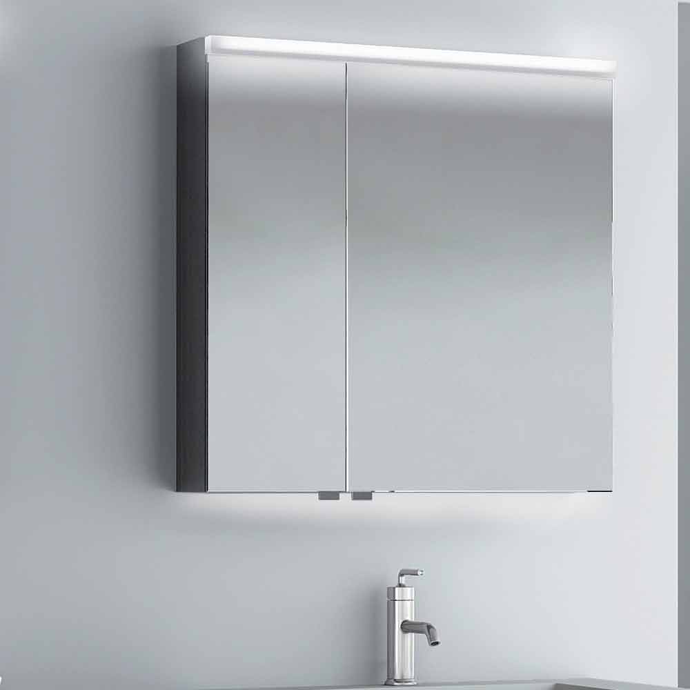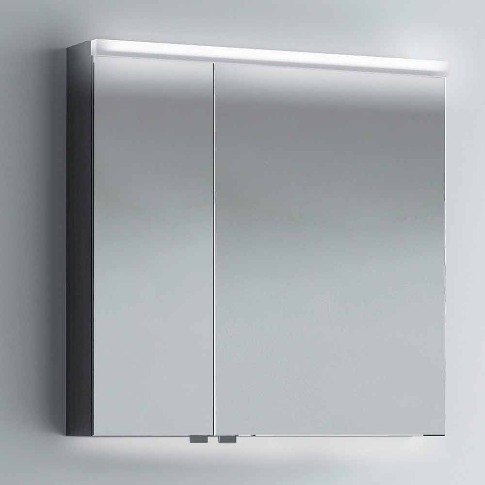 Armadietto con 2 ante a specchio. Una sottile linea di luce caratterizza il profilo di questo armadietto ad offrire una perfetta illuminazione frontale. Integrata nella struttura in alto e in basso l'illuminazione d'ambiente completa la potenza luminosa di questo specchio comandato da un sensore. Comoda l'apertura delle ante tramite maniglia in acciaio cromata. Struttura in FENIX, materiale polimerico con trattamento nano tecnologico, idrorepellente, anti impronta e morbido al tatto. Completo di presa ed interruttore.