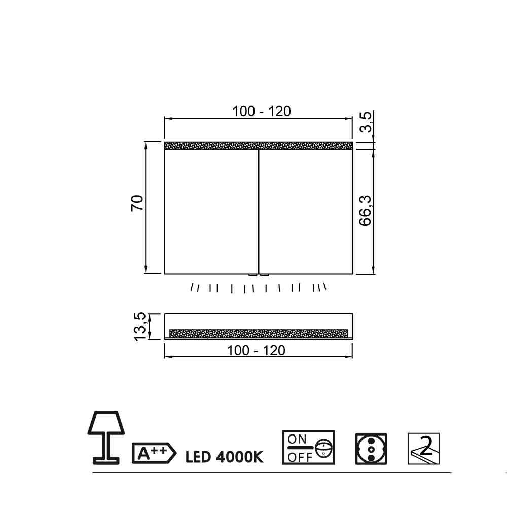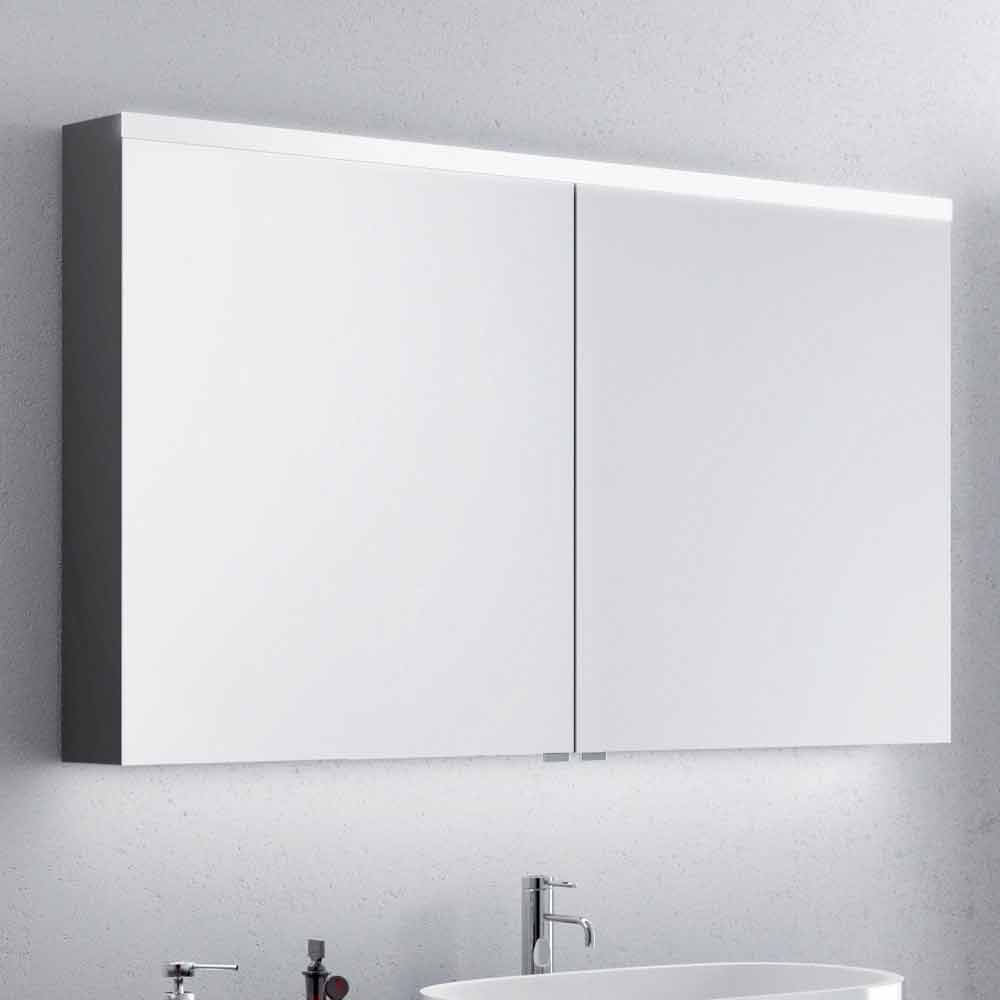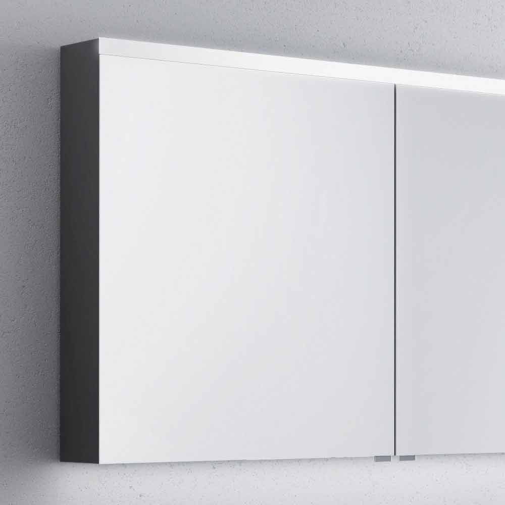 Armadietto con 2 ante a specchio. Una sottile linea di luce caratterizza il profilo di questo armadietto ad offrire una perfetta illuminazione frontale. Integrata nella struttura in alto e in basso l'illuminazione d'ambiente completa la potenza luminosa di questo specchio comandato da un sensore. Comoda l'apertura delle ante tramite maniglia in acciaio cromata. Struttura in FENIX, materiale polimerico con trattamento nano tecnologico, idrorepellente, anti impronta e morbido al tatto. Completo di presa ed interruttore.